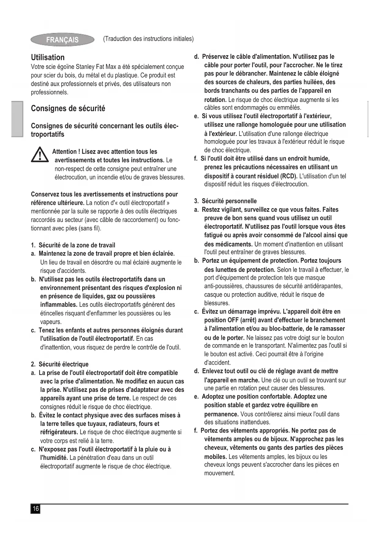Si un produit Stanley Fat Max s'avère défectueux en raison de matériaux en mauvais état ou d'une erreur humaine dans les 12 mois suivant la date d'achat, Stanley Europe garantit le remplacement gratuit ou – à sa discrétion - des pièces défectueuses si : u Le produit a été correctement utilisé et a été utilisé en respectant les instructions du manuel. u L'usure du produit est normale ; u Les réparations ont été effectuées par des personnes agréées ; u Une preuve d'achat est donnée ; u Le produit Stanley Fat Max est réexpédié avec tous les composants d'origine. Pour toutes réclamations, recherchez l'adresse du réparateur agréé Stanley le plus proche de chez vous dans le catalogue Fat Max ou contactez le bureau local Stanley à l'adresse in- diquée dans ce manuel. Une liste de réparateurs agréés Fat Max et de plus amples détails sur notre service après-vente sont disponibles sur le site Internet www.stanley.eu/323 (Traduzione del testo originale) ITALIANO Uso previsto La sega a gattuccio Stanley Fat Max è stata progettata per segare legno, plastica e lamiera. Questo strumento è destinato a professionisti e private, gli utenti non professionali. Istruzioni di sicurezza Avvisi di sicurezza generici per gli elettroutensili