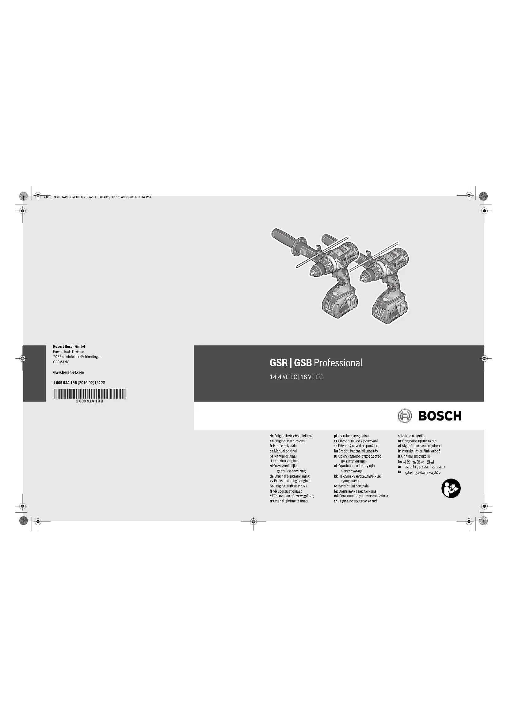 OBJ_BUCH-2671-001.book Page 16 Friday, January 22, 2016 11:09 AMEnglish | 17 Bosch Power Tools 1 609 92A 1RB | (22.1.16) Turn the bottom part of the auxiliary handle 4 in counterclock- wise direction and swivel the auxiliary handle 4 to the desired position. Then retighten the bottom part of the auxiliary han- dle 4 by turning in clockwise direction. Adjusting the Drilling Depth The required drilling depth X can be set with the depth stop 3. Loosen the wing bolt for the depth stop adjustment 6 and in- sert the depth stop rod into the auxiliary handle 4. Pull out the depth stop until the distance between the tip of the drill bit and the tip of the depth stop corresponds with the desired drilling depth X. Retighten the wing bolt for the depth stop adjustment 6 again. Changing the Tool (see figure A) Before any work on the machine itself (e. g. mainte- nance, tool change, etc.) as well as during transport and storage, remove the battery from the power tool. There is danger of injury when unintentionally actuating the On/Off switch. Open the keyless chuck 2 by turning in rotation direction , until the tool can be inserted. Insert the tool. Firmly tighten the collar of the keyless chuck 2 by hand in ro- tation direction . This automatically locks the drill chuck. Dust/Chip Extraction Dust from materials such as lead-containing coatings, some wood types, minerals and metal can be harmful to one’s health and cause allergic reactions, lead to res- piratory infections and/or cancer. Materials containing asbestos may only be worked by specialists. – Provide for good ventilation of the working place. – It is recommended to wear a P2 filter-class respirator. Observe the relevant regulations in your country for the materials to be worked. Prevent dust accumulation at the workplace. Dust can easily ignite. Operation Starting Operation Inserting the battery Note: Use of batteries not suitable for the machine can lead to malfunctions of or cause damage to the power tool. Set the rotational direction switch 17 to the centre position in order to avoid unintentional starting. Insert the charged bat- tery 12 into the handle so that it can be felt to engage and fac- es flush against the handle. Reversing the rotational direction (see figure B) The rotational direction switch 17 is used to reverse the rota- tional direction of the machine. However, this is not possible with the On/Off switch 18 actuated. Rotate clockwise: Move the rotational direction switch 17 on both sides up to the stop into position . Rotate anticlockwise: Move the rotational direction switch 17 on both sides up to the stop into position . Setting the operating mode Drilling Set the operating mode selector switch 8 to the “drilling” symbol. Screwdriving Set the operating mode selector switch 8 to the “screwdriving” symbol. Impact drilling (GSB 14,4 VE-EC, GSB 18 VE-EC) Set the operating mode selector switch 8 to the “impact drilling” symbol. Switching On and Off To start the machine, press the On/Off switch 18 and keep it pressed. The LED 14 lights up when the On/Off switch 18 is halfway or fully pressed, and enables illumination of the screwing loca- tion in unfavourable light conditions. To save energy, only switch the power tool on when using it. Adjusting the Speed The speed of the switched-on power tool can be variably ad- justed, depending on how far the On/Off switch 18 is pressed. Light pressure on the On/Off switch 18 results in a low rota- tional speed. Further pressure on the switch results in an in- crease in speed. Setting the torque (Applies to screwdriving mode) With the torque preselection ring 7, the required torque can be preselected in 25 steps. The inserted tool is stopped as soon as the set torque is reached. Gear selection, mechanical Actuate the gear selector 9 only when the machine is at a standstill. 1st gear: Low speed range; for working with large drilling diameters. 2nd gear: High speed range; for drilling with small drilling diameter. Temperature Dependent Overload Protection In normal conditions of use, the power tool cannot be over- loaded. If the power tool is overloaded or not kept within the permitted battery temperature range, the power output is re- duced or the power tool is switched off. The power tool will not run at full power output again until the permitted battery temperature has been reached. Activation of the temperature-controlled overload protector is indicated by the LED 15 on the power tool lighting up red. The LED 15 will go out once the temperature of the tool's bat- tery is back within the permissible range. Protection Against Deep Discharging The lithium-ion battery is protected against deep discharging by the “Electronic Cell Protection (ECP)”. When the battery is empty, the machine is switched off by means of a protective circuit: The inserted tool no longer rotates. OBJ_BUCH-2671-001.book Page 17 Friday, January 22, 2016 11:09 AM18 | English 1 609 92A 1RB | (22.1.16) Bosch Power Tools Rapid Shut-off The rapid shut-off feature enables better control of the power tool. The power tool shuts off in case of sudden and unexpect- ed rotation of the power tool around the drilling axis. The rapid shut-off feature is indicated by a flashing LED on the power tool. To restart the machine, release the On/Off switch and then actuate again. Rapid shut-off can trigger only when the power tool is running at maximum operating speed and can rotate freely around the drill bit axis. Choose a suitable work position for this. Otherwise, rapid shut-off will not be en- sured. Working Advice Apply the power tool to the screw only when it is switched off. Rotating tool inserts can slip off. An auxiliary tool can be used to remove the screwdriver bit or universal bit holder. Belt Clip With the belt clip 11, the machine can be hung onto a belt. The user has both hands free and the machine is always at hand. Colour clip (see figure D) You can use the colour clip 10 to individually label the 