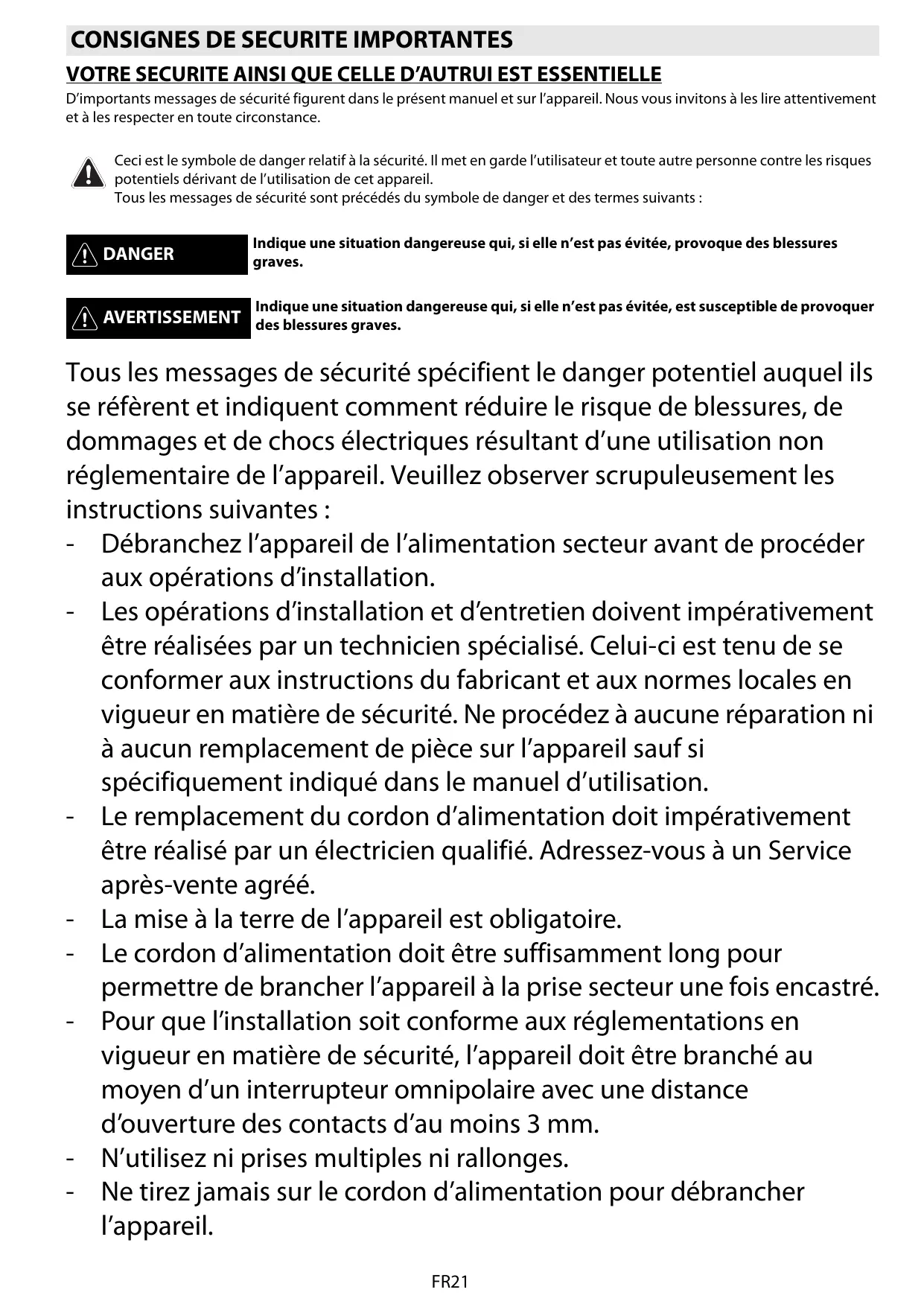 VOTRE SECURITE AINSI QUE CELLE D’AUTRUI EST ESSENTIELLE D’importants messages de sécurité figurent dans le présent manuel et sur l’appareil. Nous vous invitons à les lire attentivement et à les respecter en toute circonstance. Ceci est le symbole de danger relatif à la sécurité. Il met en garde l’utilisateur et toute autre personne contre les risques potentiels dérivant de l’utilisation de cet appareil. Tous les messages de sécurité sont précédés du symbole de danger et des termes suivants : DANGER Indique une situation dangereuse qui, si elle n’est pas évitée, provoque des blessures graves. Indique une situation dangereuse qui, si elle n’est pas évitée, est susceptible de provoquer AVERTISSEMENT des blessures graves. Tous les messages de sécurité spécifient le danger potentiel auquel ils se réfèrent et indiquent comment réduire le risque de blessures, de dommages et de chocs électriques résultant d’une utilisation non réglementaire de l’appareil. Veuillez observer scrupuleusement les instructions suivantes : - Débranchez l’appareil de l’alimentation secteur avant de procéder aux opérations d’installation. - Les opérations d’installation et d’entretien doivent impérativement être réalisées par un technicien spécialisé. Celui-ci est tenu de se conformer aux instructions du fabricant et aux normes locales en vigueur en matière de sécurité. Ne procédez à aucune réparation ni à aucun remplacement de pièce sur l’appareil sauf si spécifiquement indiqué dans le manuel d’utilisation. - Le remplacement du cordon d’alimentation doit impérativement être réalisé par un électricien qualifié. Adressez-vous à un Service après-vente agréé. - La mise à la terre de l’appareil est obligatoire. - Le cordon d’alimentation doit être suffisamment long pour permettre de brancher l’appareil à la prise secteur une fois encastré. - Pour que l’installation soit conforme aux réglementations en vigueur en matière de sécurité, l’appareil doit être branché au moyen d’un interrupteur omnipolaire avec une distance d’ouverture des contacts d’au moins 3 mm. - N’utilisez ni prises multiples ni rallonges. - Ne tirez jamais sur le cordon d’alimentation pour débrancher l’appareil. FR21 - Une fois l’installation terminée, l’utilisateur ne doit plus pouvoir accéder aux composants électriques. - Ne touchez pas l’appareil si une des parties de votre corps est mouillée et ne l’actionnez pas pieds nus. - Ce four a été conçu uniquement comme appareil ménager destiné à la cuisson des aliments. Aucune autre utilisation n’est autorisée (par ex. : chauffer une pièce). Le fabricant décline toute responsabilité en cas de mauvaise utilisation ou de réglage incorrect des commandes. - Les enfants de 8 ans et plus, ainsi que les personnes présentant des capacités physiques, sensorielles ou mentales réduites, ou un manque d’expérience et de connaissances, peuvent utiliser cet appareil sous la surveillance ou les instructions d’une personne responsable leur ayant expliqué l’utilisation de l’appareil en toute sécurité ainsi que les dangers potentiels. Les enfants ne doivent pas jouer avec l’appareil. Ils ne doivent pas le nettoyer ni procéder à son entretien sans supervision. - Les parties accessibles de l’appareil peuvent atteindre une température très élevée pendant l’utilisation. Tenez les enfants à l’écart de l’appareil et assurez-vous qu’ils ne jouent pas avec. - L’appareil, ainsi que les parties accessibles, peuvent atteindre une température très élevée pendant l’utilisation. Veillez à ne pas toucher les résistances chauffantes. Les enfants de moins de 8 ans doivent se tenir à l’écart, à moins d’être sous surveillance permanente. - Pendant et après l’utilisation, veillez à ne pas toucher les résistances chauffantes ou les surfaces intérieures du four ; vous risquez de vous brûler. Ne touchez pas le four avec des chiffons ou tout matériau inflammable avant que les composants de l’appareil n’aient suffisamment refroidis. - En fin de cuisson, prenez garde en ouvrant la porte. Laissez l’air chaud ou la vapeur s’évacuer progressivement du four avant d’y accéder. Lorsque la porte du four est fermée, l’air chaud sort à travers l’ouverture située au-dessus du bandeau de commandes. Evitez d’obstruer les ouvertures de ventilation. FR22 - Utilisez des maniques pour retirer les plats et les accessoires du four. Veillez à ne pas toucher les résistances chauffantes. - Ne placez jamais des produits inflammables à l’intérieur ou à proximité de l’appareil : ils risquent de s’enflammer si l’appareil est mis sous tension par inadvertance. - Evitez de faire chauffer ou cuire au four des aliments contenus dans des récipients hermétiques. La pression qui s’accumule à l’intérieur du récipient pourrait le faire exploser et endommager l’appareil. - N’utilisez en aucun cas des récipients en matière synthétique. - Les graisses et les huiles surchauffées s’enflamment facilement. Surveillez régulièrement la cuisson d’aliments riches en graisse ou huile. - Ne laissez jamais l’appareil sans surveillance pendant la dessiccation des aliments. - Si votre préparation nécessite l’utilisation de boissons alcoolisées (rhum, cognac, vin, par exemple), rappelez-vous que l’alcool s’évapore à hautes températures. Par conséquent, les vapeurs dégagées par l’alcool risquent de s’enflammer en entrant en contact avec la résistance chauffante électrique. - N’utilisez en aucun cas un appareil de nettoyage à vapeur. - Ne touchez pas le four pendant le nettoyage par pyrolyse. Eloignez les enfants du four pendant le nettoyage par pyrolyse (uniquement pour les fours munis de la fonction de pyrolyse). - Utilisez uniquement la sonde de température recommandée pour ce four. - N’utilisez en aucun cas des