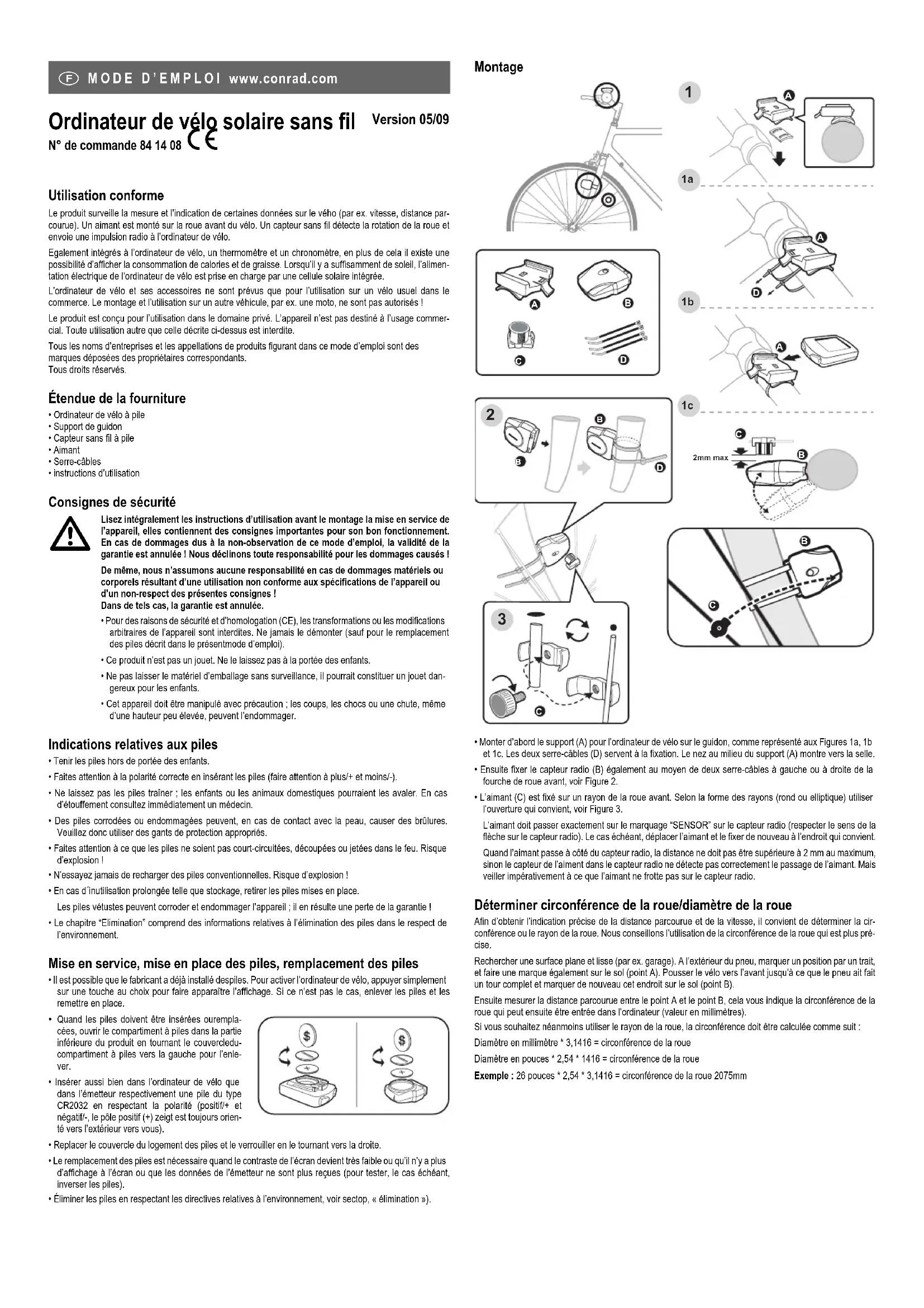 You can find the declaration of conformity at www.conrad.com. These operating instructions are a publication by Conrad Electronic SE, Klaus-Conrad-Str. 1, D-92240 Hirschau (www.conrad.com). All rights including translation reserved. Reproduction by any method, e.g. photocopy, microfilming, or the capture in electronic data processing systems require the prior written approval by the editor. Reprinting, also in part, is prohibited. These operating instructions represent the technical status at the time of printing. Changes in technology and equipment reserved. © Copyright 2009 by Conrad Electronic SE.Ordinateur de vélo solaire sans fil Version 05/09 N° de commande 84 14 08 ° Utilisation conforme Le produit surveille la mesure et l’indication de certaines données sur le vého (par ex. vitesse, distance par-courue). Un aimant est monté sur la roue avant du vélo. Un capteur sans fil détecte la rotation de la roue etenvoie une impulsion radio à l’ordinateur de vélo. Egalement intégrés à l’ordinateur de vélo, un thermomètre et un chronomètre, en plus de cela il existe unepossibilité d’afficher la consommation de calories et de graisse. Lorsqu’il y a suffisamment de soleil, l’alimen-tation électrique de l’ordinateur de vélo est prise en charge par une cellule solaire intégrée.L’ordinateur de vélo et ses accessoires ne sont prévus que pour l’utilisation sur un vélo usuel dans lecommerce. Le montage et l’utilisation sur un autre véhicule, par ex. une moto, ne sont pas autorisés !Le produit est conçu pour l’utilisation dans le domaine privé. L’appareil n’est pas destiné à l’usage commer-cial. Toute utilisation autre que celle décrite ci-dessus est interdite.Tous les noms d’entreprises et les appellations de produits figurant dans ce mode d’emploi sont desmarques déposées des propriétaires correspondants. Tous droits réservés. Étendue de la fourniture