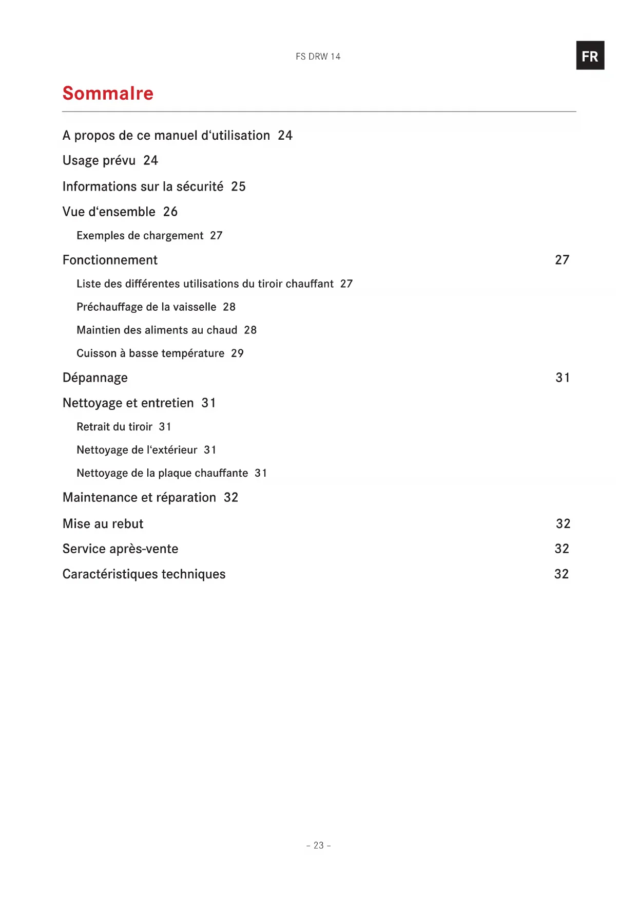 sommaire A propos de ce manuel d‘utilisation 24 Usage prévu 24 Informations sur la sécurité 25 Vue d‘ensemble 26 Exemples de chargement 27 Fonctionnement 27 Liste des différentes utilisations du tiroir chauffant 27 Préchauffage de la vaisselle 28 Maintien des aliments au chaud 28 Cuisson à basse température 29 Dépannage 31 Nettoyage et entretien 31 Retrait du tiroir 31 Nettoyage de l‘extérieur 31 Nettoyage de la plaque chauffante 31 Maintenance et réparation 32 Mise au rebut 32 Service après-vente 32 Caractéristiques techniques 32FS DRW 14 – 24 –
