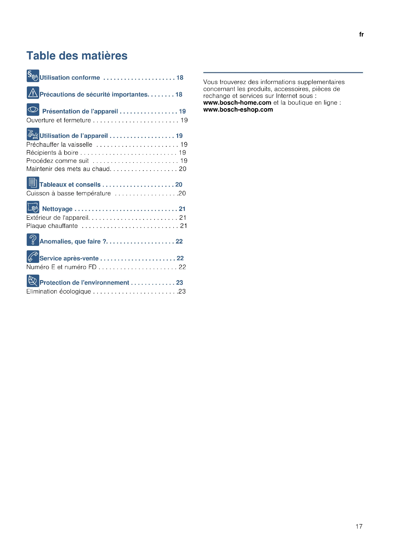 - Présentation de l'appareil . . . . . . . . . . . . . . . . . 19 Ouverture et fermeture . . . . . . . . . . . . . . . . . . . . . . . . 19 1 Utilisation de l’appareil . . . . . . . . . . . . . . . . . . . 19 Préchauffer la vaisselle . . . . . . . . . . . . . . . . . . . . . . . 19 Récipients à boire . . . . . . . . . . . . . . . . . . . . . . . . . . . 19 Procédez comme suit . . . . . . . . . . . . . . . . . . . . . . . . 19 Maintenir des mets au chaud. . . . . . . . . . . . . . . . . . . 20 J Tableaux et conseils . . . . . . . . . . . . . . . . . . . . . 20 Cuisson à basse température . . . . . . . . . . . . . . . . . .20 D Nettoyage . . . . . . . . . . . . . . . . . . . . . . . . . . . . . . 21 Extérieur de l'appareil. . . . . . . . . . . . . . . . . . . . . . . . . 21 Plaque chauffante . . . . . . . . . . . . . . . . . . . . . . . . . . . 21 3 Anomalies, que faire ?. . . . . . . . . . . . . . . . . . . . 22 4 Service après-vente . . . . . . . . . . . . . . . . . . . . . . 22 Numéro E et numéro FD . . . . . . . . . . . . . . . . . . . . . . 22 7 Protection de l'environnement . . . . . . . . . . . . . 23 Elimination écologique . . . . . . . . . . . . . . . . . . . . . . . .23 Produktinfo Vous trouverez des informations supplementaires concernant les produits, accessoires, pièces de rechange et services sur Internet sous : www.bosch-home.com et la boutique en ligne : www.bosch-eshop.comfr Utilisation conforme