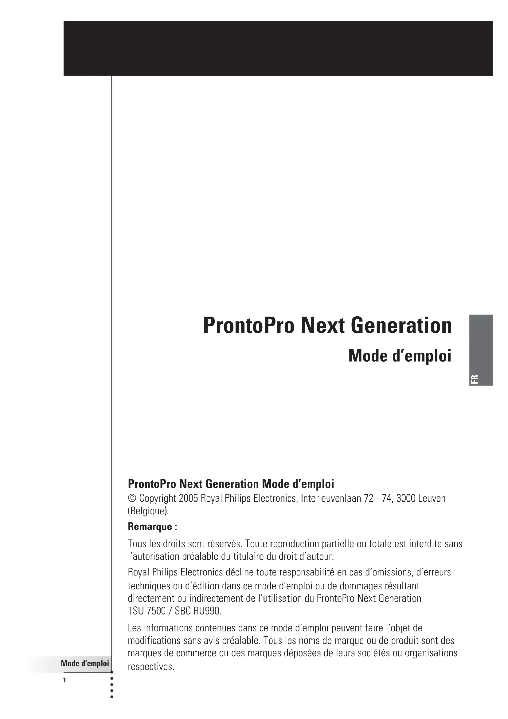 ProntoPro Next Generation Mode d’emploi © Copyright 2005 Royal Philips Electronics, Interleuvenlaan 72 - 74, 3000 Leuven (Belgique). Remarque : Tous les droits sont réservés. Toute reproduction partielle ou totale est interdite sans l’autorisation préalable du titulaire du droit d’auteur. Royal Philips Electronics décline toute responsabilité en cas d’omissions, d’erreurs techniques ou d’édition dans ce mode d’emploi ou de dommages résultant directement ou indirectement de l’utilisation du ProntoPro Next Generation TSU 7500 / SBC RU990. Les informations contenues dans ce mode d’emploi peuvent faire l’objet de modifications sans avis préalable. Tous les noms de marque ou de produit sont des marques de commerce ou des marques déposées de leurs sociétés ou organisations respectives. ProntoPro Next Generation Mode d’emploi ProntoProNG_0505_ML_3FR.qxd 14-06-2005 09:46 Pagina 1Mode d’emploi