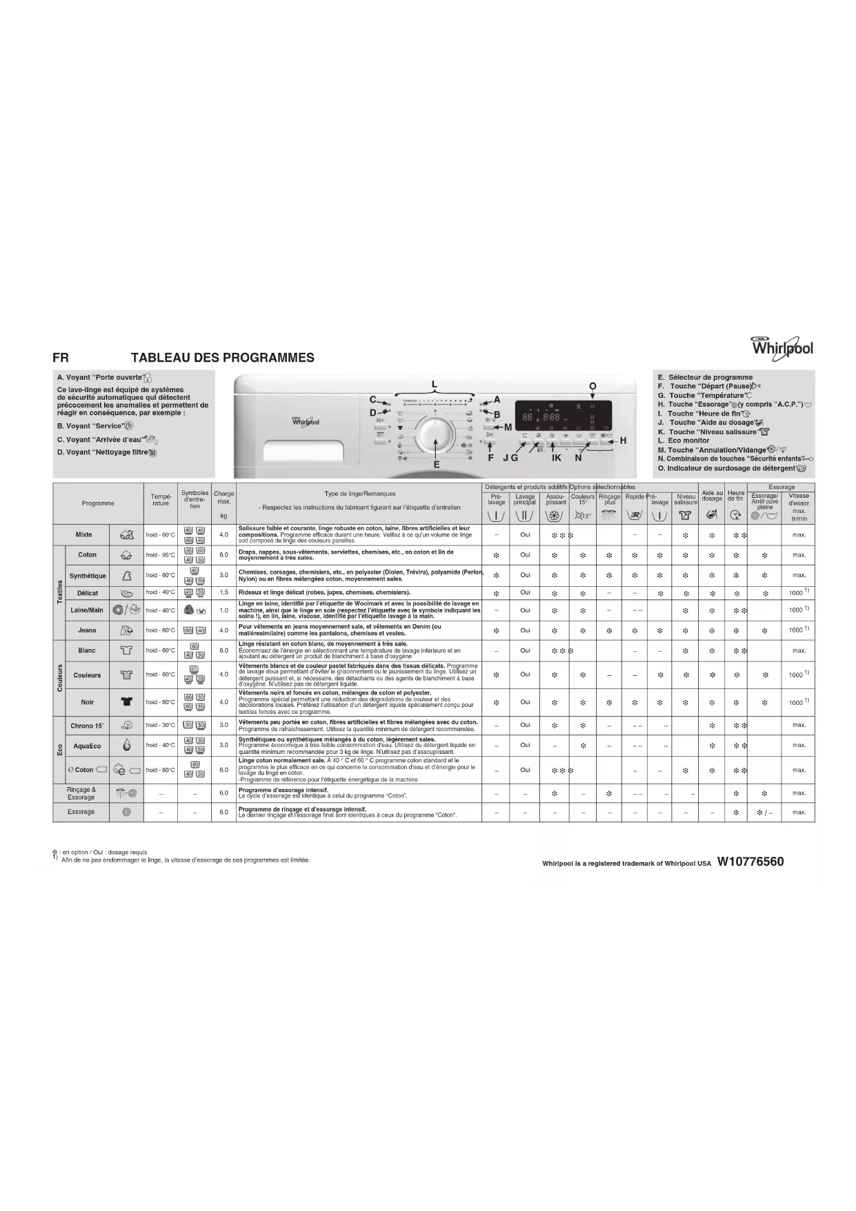 Afin de ne pas endommager le linge, la vitesse d’essorage de ces programmes est limitée. Whirlpool is a registered trademark of Whirlpool USA W10776560 ProgrammeTempé-ratureSymbolesd’entre- tien Charge max.