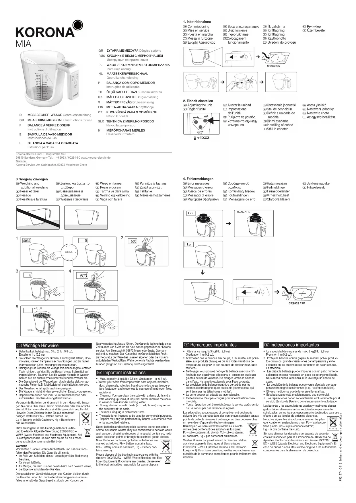 Résistance jusqu’à 3 kg 6 lb : 9,8 oz), Graduation 1 g (0,2 oz). N’exposez pas la balance aux coups, à l’humidité, à la pous-sière, aux produits chimiques ou aux fortes variations de température; éloignez-le des sources de chaleur (four, radia-teur etc.). Nettoyage: vous pouvez nettoyer la balance avec un chif-fon hude sur lequel vous déposerez si besoin est quelques gouttes de liquide vaisselle. Ne plongez jamais la balance dans l’eau. Ne la nettoyez jamais sous l’eau courante. La précision de la balance peut être perturbée par les champs électromagnétiques puissants (comme ceux qui sont émis par les téléphones mobiles). Le verre doseur est adapté au lave-vaisselle. Cette balance n’est pas conçue pour une utilisation com-merciale. Toute réparation doit être réalisée par le service après-vente de Beurer ou par des revendeurs agréés. es piles et les accus usagés et complètement déchargés doivent être mis au rebut dans des conteneurs spéciaux ou aux points de collecte réservés à cet usage, ou bien déposés chez un revendeur d’appareils électro-ménagers. Remarque : Vous trouverez les symboles suivants sur les piles contenant des substances toxiques: Pb = pile contenant du plomb, Cd = pile contenant du cadmium, Hg = pile contenant du mercure. euillez éliminer l’appareil suivant la directive relative aux vieux appareils électriques et électroniques 2002/96/CE – WEEE (Waste Electrical and Electronic Equipment). Pour toute question, veuillez vous adresser aux autorités de la commune compétentes pour le traitement des déchets.
