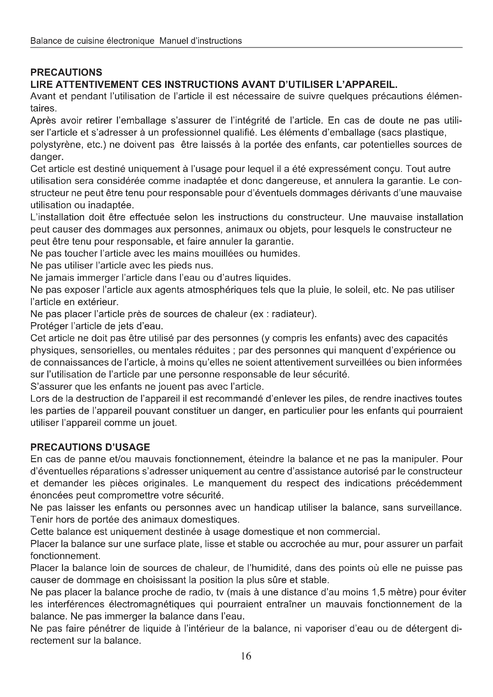 Ne pas placer la balance proche de radio, TV (mais à une distance d'au moins 1,5 mètre) pour éviter les interférences électromagnétiques qui pourraient entraîner un mauvais fonctionnement de la balance. Ne pas immerger la balance dans l'eau.