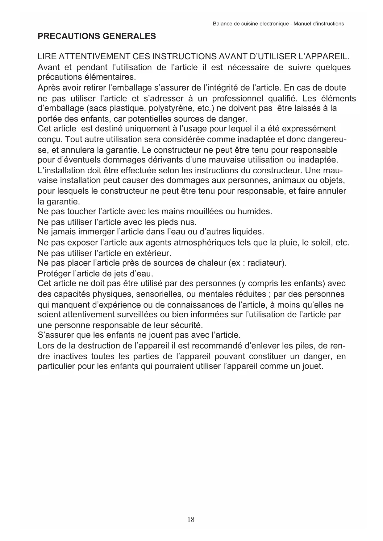 La casse ou dommage occasionnés à la balance, dus à une mauvaise utilisation et non respect des règles énoncées dans ce manuel, ne sont pas reconnus par la garantie.