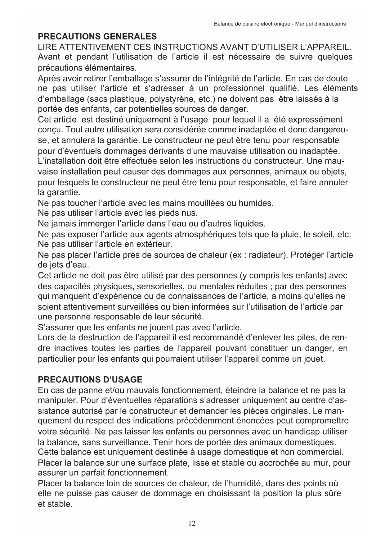 LIRE ATTENTIVEMENT CES INSTRUCTIONS AVANT D'UTILISER L'APPAREIL. Avant et pendant l'utilisation de l'article il est nécessaire de suivre quelques précautions élémentaires.