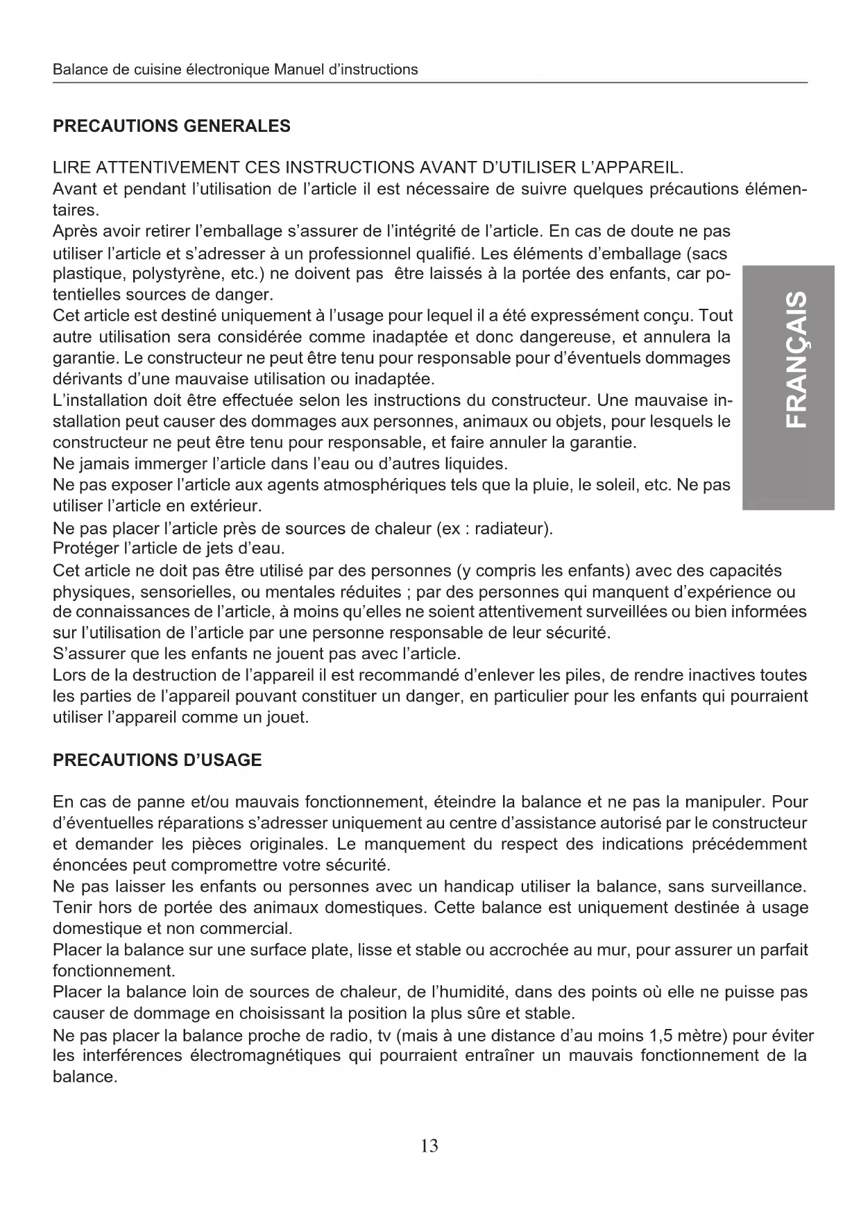 La casse ou dommage occasionnés à la balance, dus à une mauvaise utilisation et non respect des régles énoncées dans ce manuel, ne sont pas reconnus par la garantie.