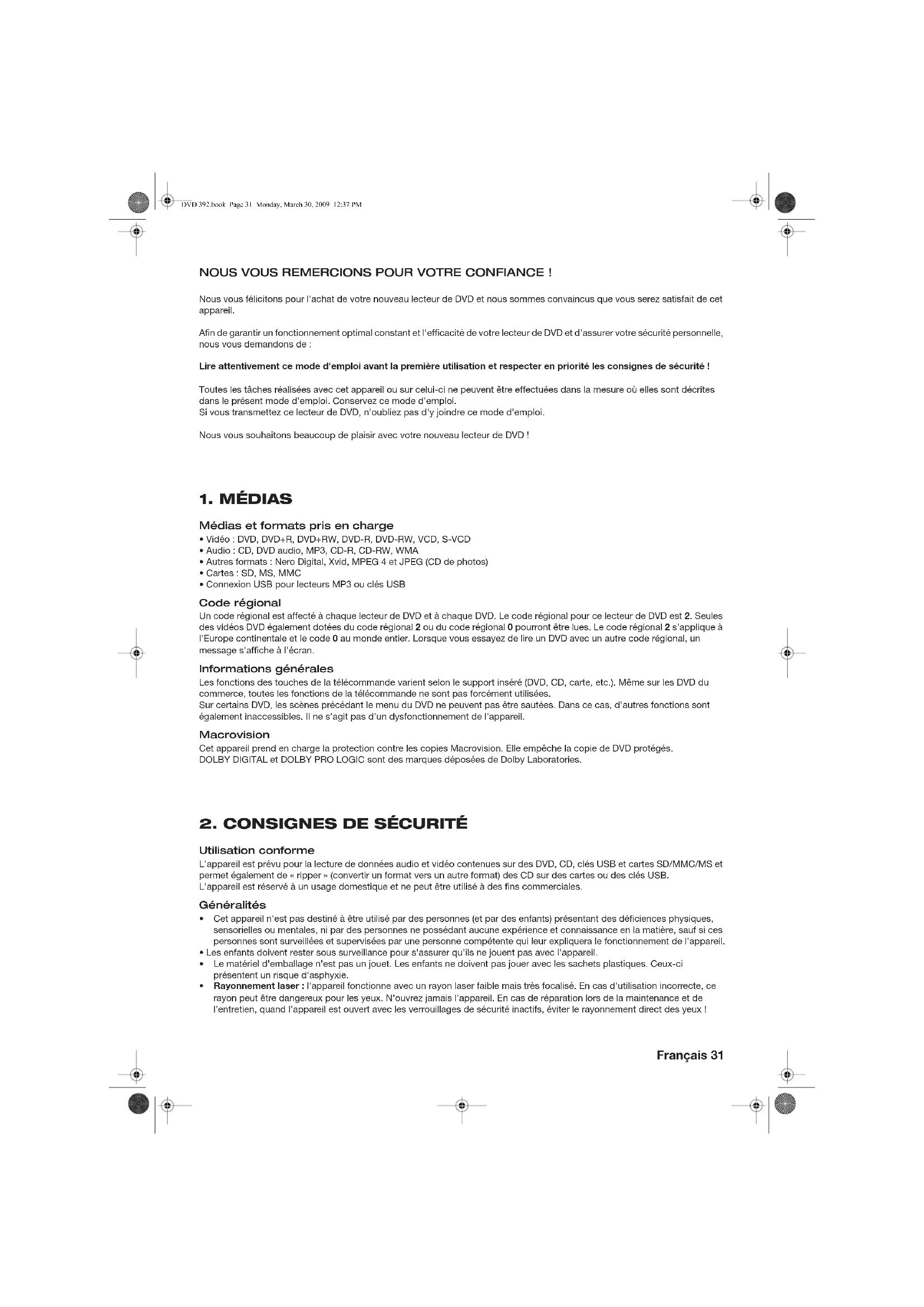 DVD 392.book Page 30 Monday, March 30, 2009 12:37 PMFrançais 31 NOUS VOUS REMERCIONS POUR VOTRE CONFIANCE ! Nous vous félicitons pour l'achat de votre nouveau lecteur de DVD et nous sommes convaincus que vous serez satisfait de cet appareil. Afin de garantir un fonctionnement optimal constant et l'efficacité de votre lecteur de DVD et d'assurer votre sécurité personnelle, nous vous demandons de : Lire attentivement ce mode d'emploi avant la première utilisation et respecter en priorité les consignes de sécurité ! Toutes les tâches réalisées avec cet appareil ou sur celui-ci ne peuvent être effectuées dans la mesure où elles sont décrites dans le présent mode d'emploi. Conservez ce mode d'emploi. Si vous transmettez ce lecteur de DVD, n'oubliez pas d'y joindre ce mode d'emploi. Nous vous souhaitons beaucoup de plaisir avec votre nouveau lecteur de DVD !