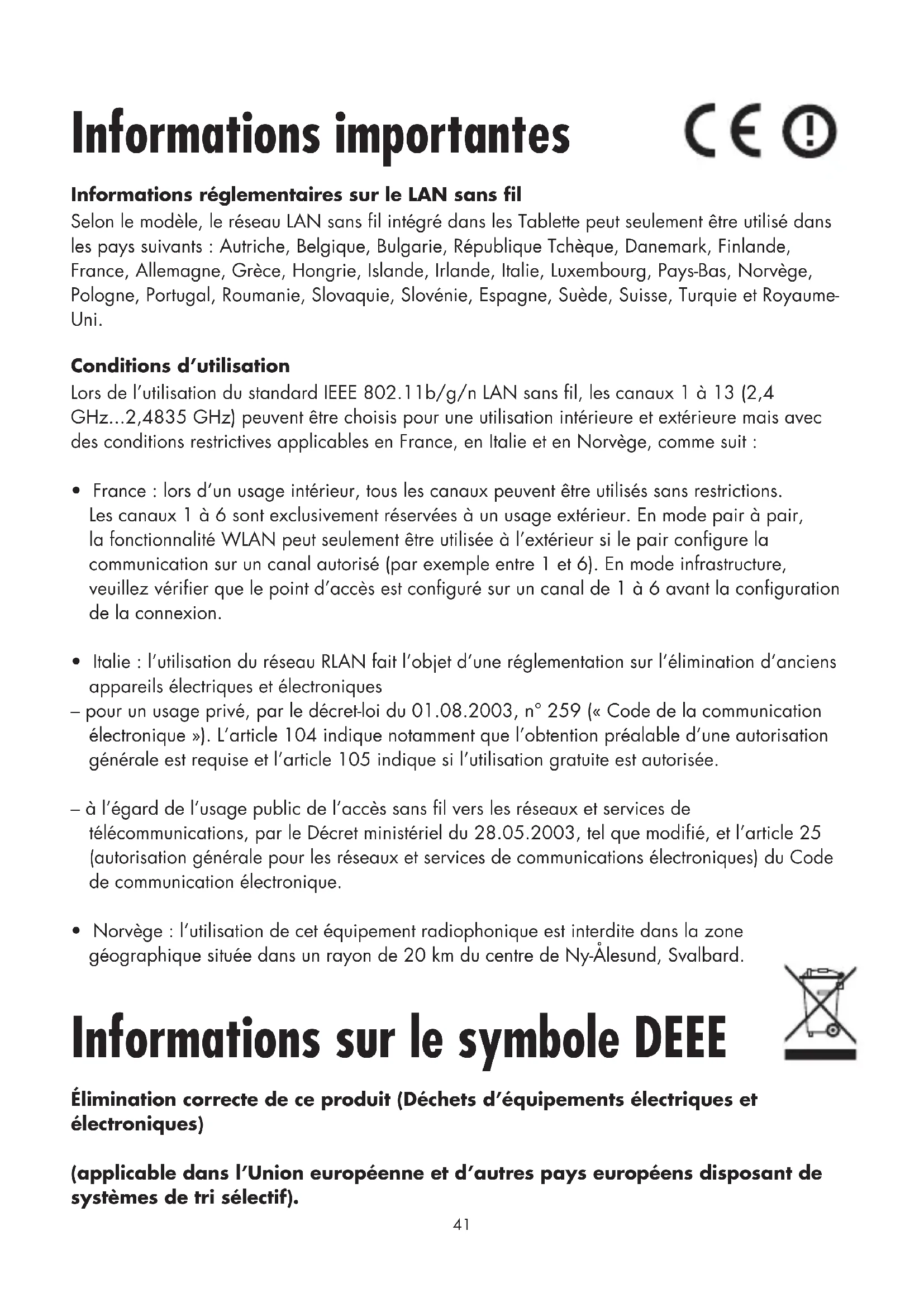 Informations importantes Informations réglementaires sur le LAN sans fil Selon le modèle, le réseau LAN sans fil intégré dans les Tablette peut seulement être utilisé dans les pays suivants : Autriche, Belgique, Bulgarie, République Tchèque, Danemark, Finlande, France, Allemagne, Grèce, Hongrie, Islande, Irlande, Italie, Luxembourg, Pays-Bas, Norvège, Pologne, Portugal, Roumanie, Slovaquie, Slovénie, Espagne, Suède, Suisse, Turquie et Royaume- Uni. Conditions d’utilisation Lors de l’utilisation du standard IEEE 802.11b/g/n LAN sans fil, les canaux 1 à 13 (2,4 GHz...2,4835 GHz) peuvent être choisis pour une utilisation intérieure et extérieure mais avec des conditions restrictives applicables en France, en Italie et en Norvège, comme suit :