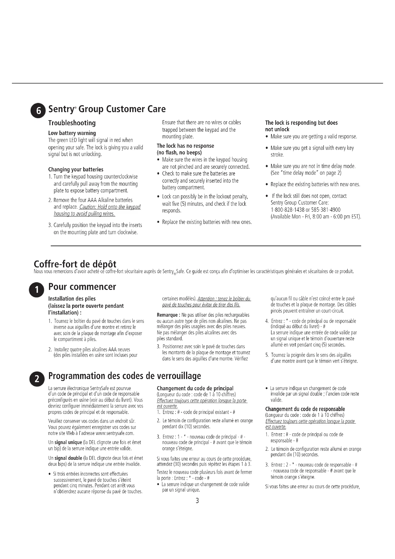 Si la serraure ne s'ouvre toujours pas,contactez le service clientèle de Sentry Group:1-800-828- 1438 ou 585-381-4900 (disponible du lundi au vendredi,de 8 h 00 à 18 h 00,heure de l'Est).