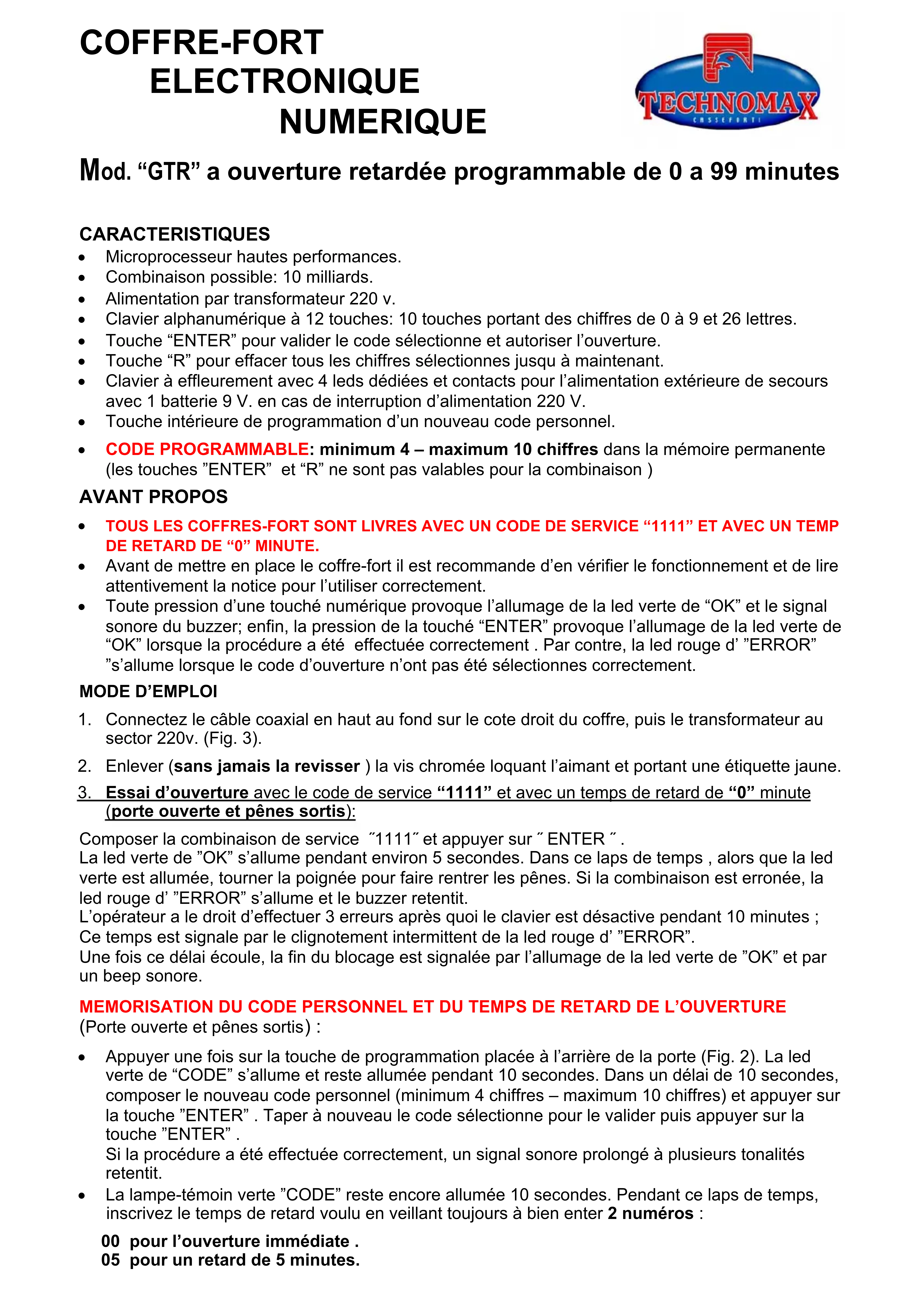 TOUS LES COFFRES-FORT SONT LIVRES AVEC UN CODE DE SERVICE "1111" ET AVEC UN TEMP DE RETARD DE "0" MINUTE.