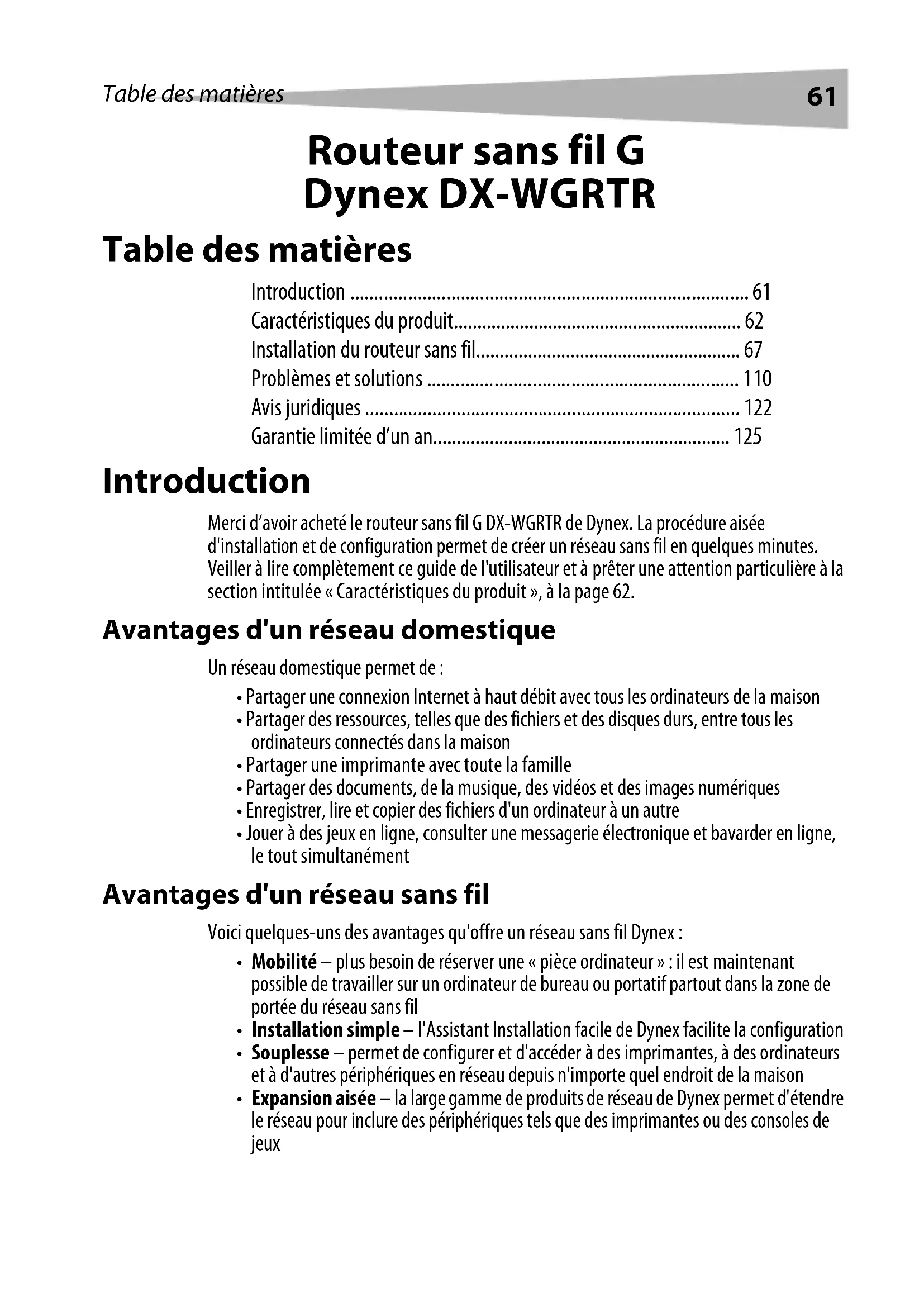 - Garantie limitée d’un an Introduction Merci d’avoir acheté le routeur sans fil G DX-WGRTR de Dynex. La procédure aisée d'installation et de configuration permet de créer un réseau sans fil en quelques minutes. Veiller à lire complètement ce guide de l'utilisateur et à prêter une attention particulière à la section intitulée « Caractéristiques du produit », à la page 62. Avantages d'un réseau domestique Un réseau domestique permet de : p. 125
