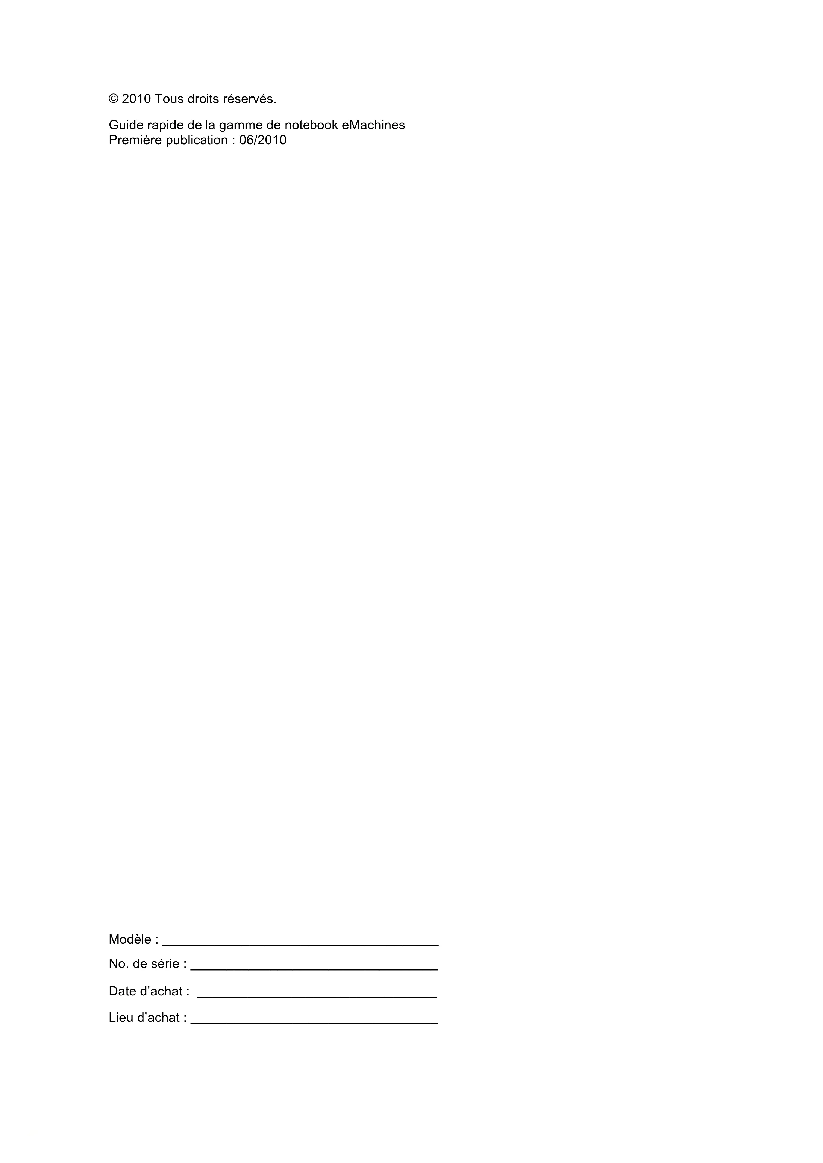 4Gamme de notebook eMachines Guide rapideModèle : ______________________________________ No. de série : __________________________________ Date d’achat : _________________________________ Lieu d’achat : __________________________________ © 2010 Tous droits réservés. Guide rapide de la gamme de notebook eMachines Première publication : 06/20103 Pour commencer Nous désirons vous remercier d’avoir fait d’un notebook eMachines votre choix pour répondre à vos besoins informatiques mobiles. Vos guides Pour vous aider à utiliser votre notebook eMachines, nous avons conçu plusieurs guides : Tout d’abord, le poster de configuration vous aide à configurer votre ordinateur. Le Guide utilisateur générique eMachines contient des informations utiles qui s’appliquent à tous les modèles de la gamme des produits eMachines. Il couvre les sujet de base, telles que la récupération du système, utiliser le clavier, le son, etc. Il faut comprendre que du fait de sa nature, le Guide utilisateur générique eMachines fera référence parfois à des fonctions ou des caractéristiques qui ne sont contenues que dans certains modèles, mais pas nécessaire dans le modèle que vous avez acheté. Ces cas sont marqués dans le texte avec des mentions telles que « seulement pour certains modèles ». Ce Guide rapide présente les fonctionnalités et fonctions de base de votre ordinateur. Pour plus d’information sur l’aide que peut vous apporter pour être plus productif, veuillez vous reporter au Guide utilisateur générique eMachines, qui contient des informations détaillées sur des sujets tels que les utilitaires systèmes, la récupération des données, les options d’extension et le dépannage. De plus, il contient des informations de garantie et les réglementations générales et les avis de sécurité pour votre notebook. Il est disponible au format PDF (Portable Document Format) et est préchargé sur votre notebook. Procédez comme suit pour y accéder : 1 Cliquez sur Démarrer > Tous les programmes > Documentation eMachines. 2 Cliquez sur Guide utilisateur générique eMachines. Remarque : L’affichage du fichier nécessite Adobe Reader. Si Adobe Reader n’est pas installé dans votre ordinateur, le clic sur le Guide utilisateur générique eMachines va exécuter le programme d’installation d’Adobe Reader. Suivez les instructions à l’écran pour terminer l’installation. Pour des instructions sur l’utilisation de Adobe Reader, accédez au menu Aide et Support.4 Français Visite guidée de votre notebook eMachines Après avoir configuré votre ordinateur comme illustré dans le poster de configuration, nous allons vous faire explorer votre nouveau notebook eMachines. Vue supérieure