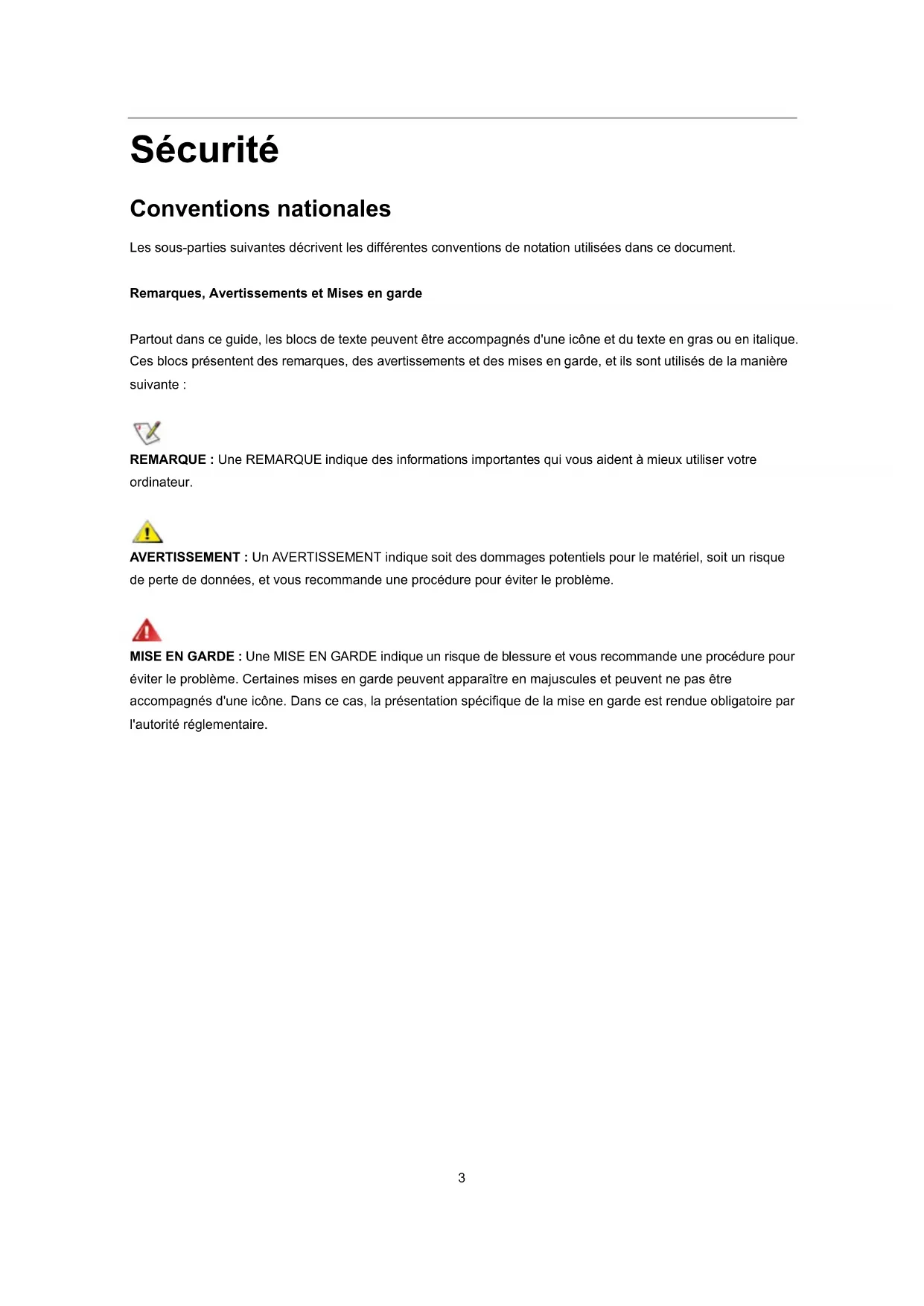 Sécurité Conventions nationales Les sous-parties suivantes décrivent les différentes conventions de notation utilisées dans ce document. Remarques, Avertissements et Mises en garde Partout dans ce guide, les blocs de texte peuvent être accompagnés d'une icône et du texte en gras ou en italique. Ces blocs présentent des remarques, des avertissements et des mises en garde, et ils sont utilisés de la manière suivante :
