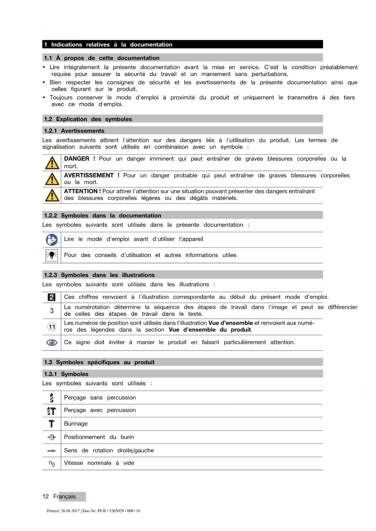 Les symboles suivants sont utilisés : Perçage sans percussion Perçage avec percussion Burinage Positionnement du burin Sens de rotation droite/gauche Vitesse nominale à vide Printed: 28.08.2017 | Doc-Nr: PUB / 5265029 / 000 / 01Français 13
