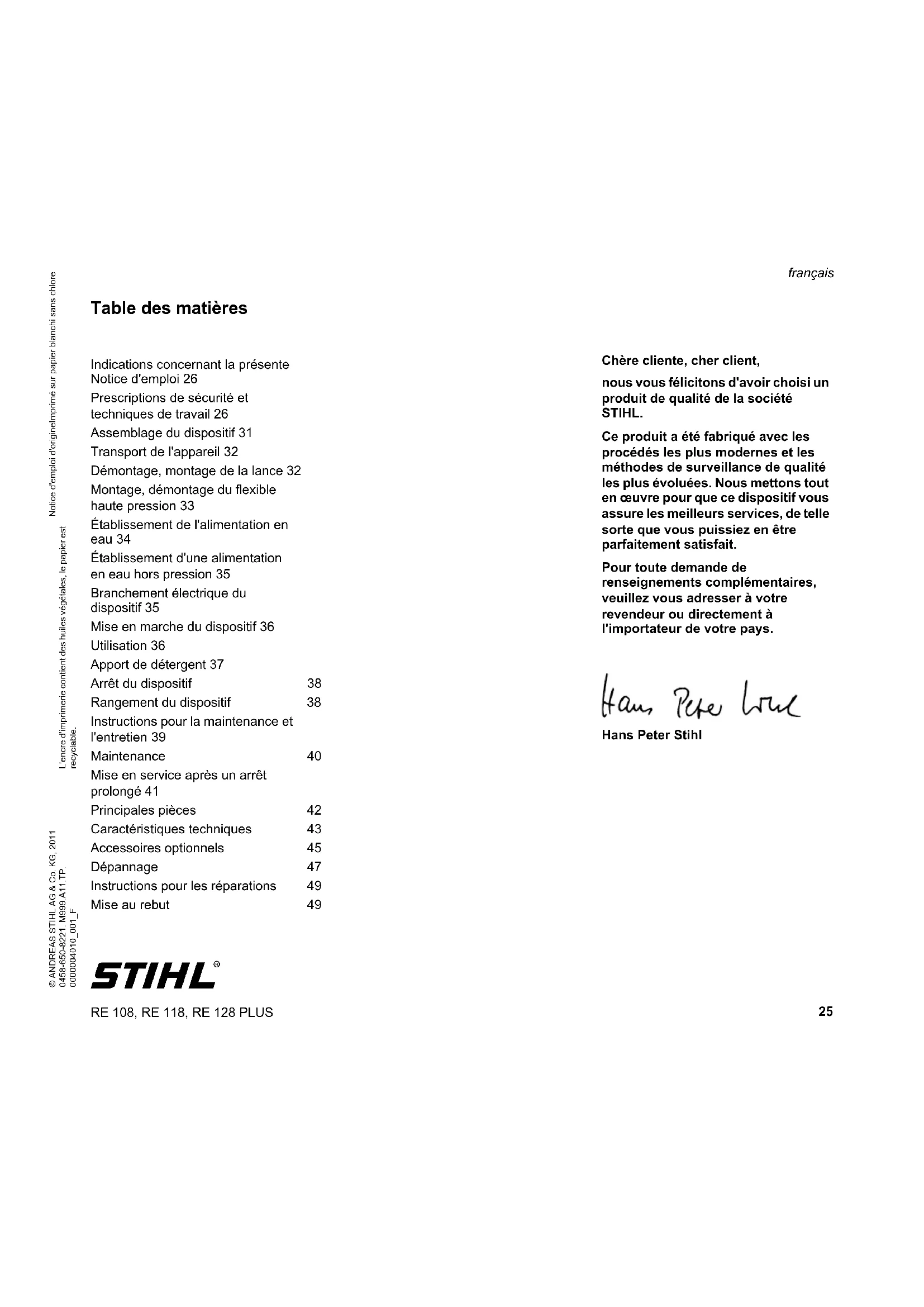 Table des matières Chère cliente, cher client, nous vous félicitons d'avoir choisi un produit de qualité de la société STIHL. Ce produit a été fabriqué avec les procédés les plus modernes et les méthodes de surveillance de qualité les plus évoluées. Nous mettons tout en œuvre pour que ce dispositif vous assure les meilleurs services, de telle sorte que vous puissiez en être parfaitement satisfait. Pour toute demande de renseignements complémentaires, veuillez vous adresser à votre revendeur ou directement à l'importateur de votre pays. Hans Peter Stihl Indications concernant la présente Notice d'emploi 26 Prescriptions de sécurité et techniques de travail 26 Assemblage du dispositif 31 Transport de l'appareil 32 Démontage, montage de la lance 32 Montage, démontage du flexible haute pression 33 Établissement de l'alimentation en eau 34 Établissement d'une alimentation en eau hors pression 35 Branchement électrique du dispositif 35 Mise en marche du dispositif 36 Utilisation 36 Apport de détergent 37 Arrêt du dispositif 38 Rangement du dispositif 38 Instructions pour la maintenance et l'entretien 39 Maintenance 40 Mise en service après un arrêt prolongé 41 Principales pièces 42 Caractéristiques techniques 43 Accessoires optionnels 45 Dépannage 47 Instructions pour les réparations 49 Mise au rebut 49RE 108, RE 118, RE 128 PLUS français