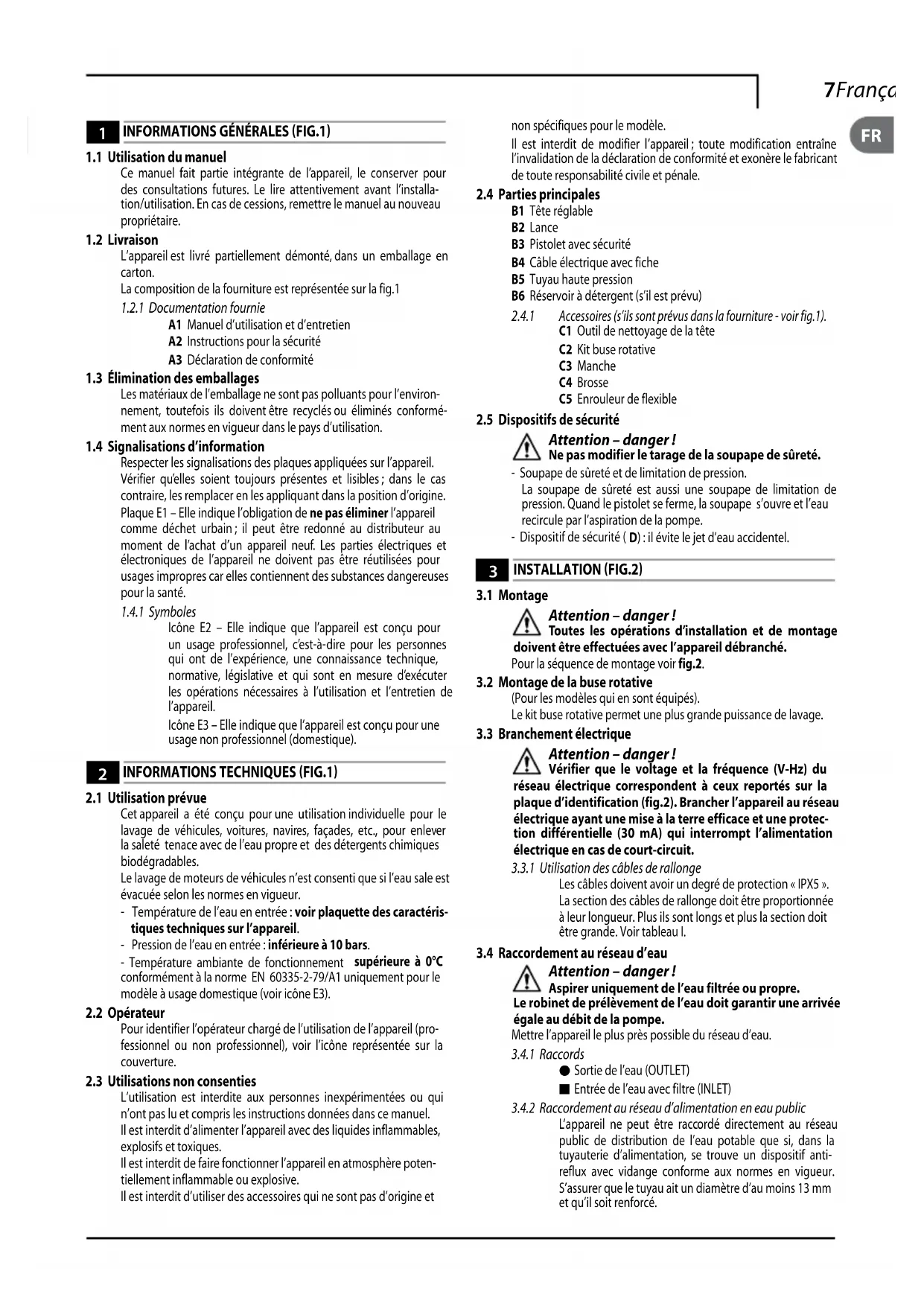 Attention – danger ! Vérifier que le voltage et la fréquence (V-Hz) du réseau électrique correspondent à ceux reportés sur la plaque d’identification (fig.2). Brancher l’appareil au réseau électrique ayant une mise à la terre efficace et une protec-tion différentielle (30 mA) qui interrompt l’alimentation électrique en cas de court-circuit.