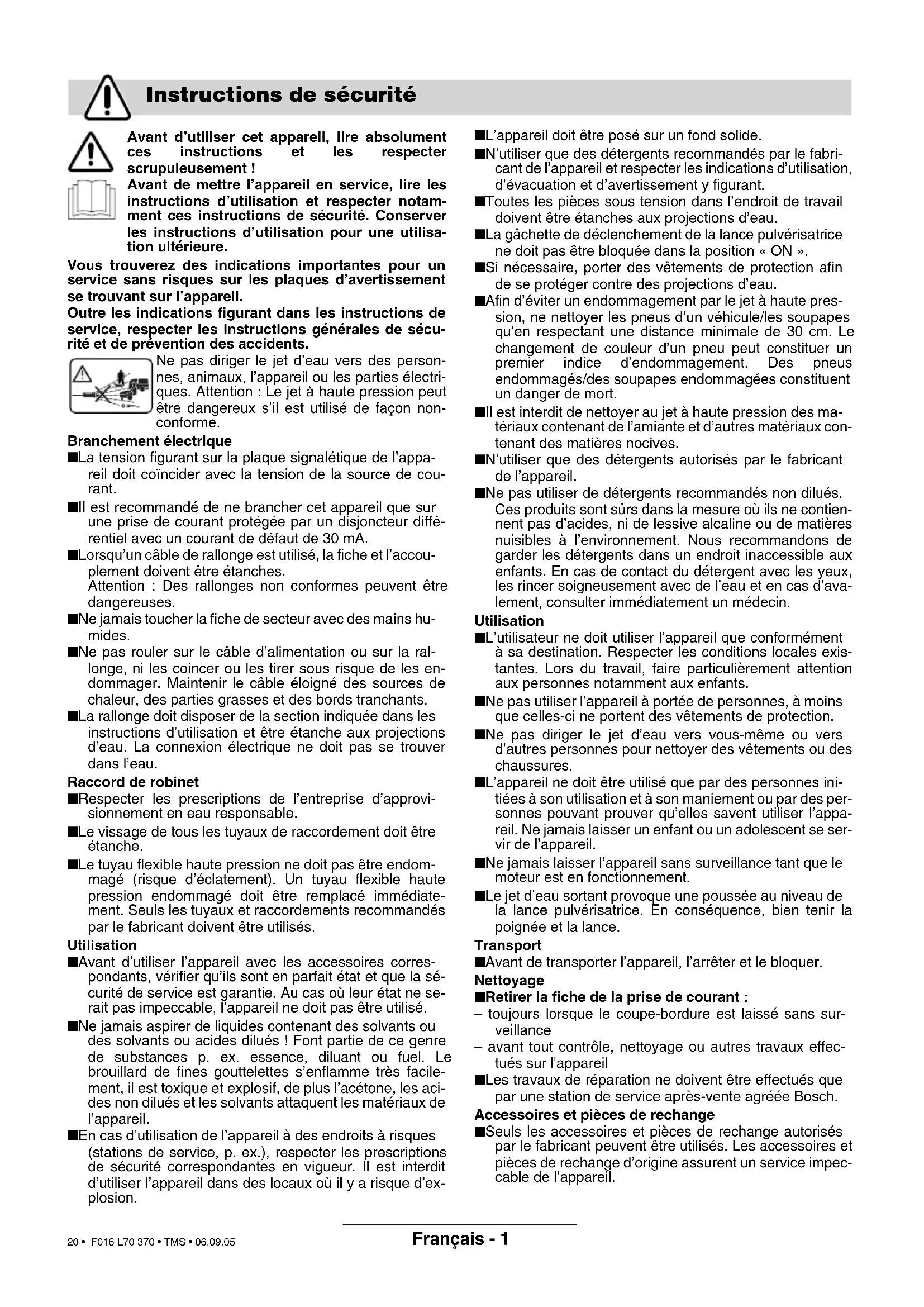 is lower than 91 dB (A). Conformity assess- ment procedure according to Annex VIII. Leinfelden, 01.11.2004. Dr. Egbert Schneider Dr. Eckerhard Strötgen Senior Vice President Head of Product Engineering Certification Robert Bosch GmbH, Power Tools Division Subject to change without notice Environmental Protection Disposal Service Declaration of Conformity F016 L70 370 - GB Seite 7 Donnerstag, 29. September 2005 2:57 14Français - 1 Avant d’utiliser cet appareil, lire absolument ces instructions et les respecter scrupuleusement ! Avant de mettre l’appareil en service, lire les instructions d’utilisation et respecter notam- ment ces instructions de sécurité. Conserver les instructions d’utilisation pour une utilisa- tion ultérieure. Vous trouverez des indications importantes pour un service sans risques sur les plaques d’avertissement se trouvant sur l’appareil. Outre les indications figurant dans les instructions de service, respecter les instructions générales de sécu- rité et de prévention des accidents. Ne pas diriger le jet d’eau vers des person- nes, animaux, l’appareil ou les parties électri- ques. Attention : Le jet à haute pression peut être dangereux s’il est utilisé de façon non- conforme. Branchement électrique ■ La tension figurant sur la plaque signalétique de l’appa- reil doit coïncider avec la tension de la source de cou- rant. ■ Il est recommandé de ne brancher cet appareil que sur une prise de courant protégée par un disjoncteur diffé- rentiel avec un courant de défaut de 30 mA. ■ Lorsqu’un câble de rallonge est utilisé, la fiche et l’accou- plement doivent être étanches. Attention : Des rallonges non conformes peuvent être dangereuses. ■ Ne jamais toucher la fiche de secteur avec des mains hu- mides. ■ Ne pas rouler sur le câble d’alimentation ou sur la ral- longe, ni les coincer ou les tirer sous risque de les en- dommager. Maintenir le câble éloigné des sources de chaleur, des parties grasses et des bords tranchants. ■ La rallonge doit disposer de la section indiquée dans les instructions d’utilisation et être étanche aux projections d’eau. La connexion électrique ne doit pas se trouver dans l’eau. Raccord de robinet ■ Respecter les prescriptions de l’entreprise d’approvi- sionnement en eau responsable. ■ Le vissage de tous les tuyaux de raccordement doit être étanche. ■ Le tuyau flexible haute pression ne doit pas être endom- magé (risque d’éclatement). Un tuyau flexible haute pression endommagé doit être remplacé immédiate- ment. Seuls les tuyaux et raccordements recommandés par le fabricant doivent être utilisés. Utilisation ■ Avant d’utiliser l’appareil avec les accessoires corres- pondants, vérifier qu’ils sont en parfait état et que la sé- curité de service est garantie. Au cas où leur état ne se- rait pas impeccable, l’appareil ne doit pas être utilisé. ■ Ne jamais aspirer de liquides contenant des solvants ou des solvants ou acides dilués ! Font partie de ce genre de substances p. ex. essence, diluant ou fuel. Le brouillard de fines gouttelettes s’enflamme très facile- ment, il est toxique et explosif, de plus l’acétone, les aci- des non dilués et les solvants attaquent les matériaux de l’appareil. ■ En cas d’utilisation de l’appareil à des endroits à risques (stations de service, p. ex.), respecter les prescriptions de sécurité correspondantes en vigueur. Il est interdit d’utiliser l’appareil dans des locaux où il y a risque d’ex- plosion. ■ L’appareil doit être posé sur un fond solide. ■ N’utiliser que des détergents recommandés par le fabri- cant de l’appareil et respecter les indications d’utilisation, d’évacuation et d’avertissement y figurant. ■ Toutes les pièces sous tension dans l’endroit de travail doivent être étanches aux projections d’eau. ■ La gâchette de déclenchement de la lance pulvérisatrice ne doit pas être bloquée dans la position « ON ». ■ Si nécessaire, porter des vêtements de protection afin de se protéger contre des projections d’eau. ■ Afin d’éviter un endommagement par le jet à haute pres- sion, ne nettoyer les pneus d’un véhicule/les soupapes qu’en respectant une distance minimale de 30 cm. Le changement de couleur d’un pneu peut constituer un premier indice d’endommagement. Des pneus endommagés/des soupapes endommagées constituent un danger de mort. ■ Il est interdit de nettoyer au jet à haute pression des ma- tériaux contenant de l’amiante et d’autres matériaux con- tenant des matières nocives. ■ N’utiliser que des détergents autorisés par le fabricant de l’appareil. ■ Ne pas utiliser de détergents recommandés non dilués. Ces produits sont sûrs dans la mesure où ils ne contien- nent pas d’acides, ni de lessive alcaline ou de matières nuisibles à l’environnement. Nous recommandons de garder les détergents dans un endroit inaccessible aux enfants. En cas de contact du détergent avec les yeux, les rincer soigneusement avec de l’eau et en cas d’ava- lement, consulter immédiatement un médecin. Utilisation ■ L’utilisateur ne doit utiliser l’appareil que conformément à sa destination. Respecter les conditions locales exis- tantes. Lors du travail, faire particulièrement attention aux personnes notamment aux enfants. ■ Ne pas utiliser l’appareil à portée de personnes, à moins que celles-ci ne portent des vêtements de protection. ■ Ne pas diriger le jet d’eau vers vous-même ou vers d’autres personnes pour nettoyer des vêtements ou des chaussures. ■ L’appareil ne doit être utilisé que par des personnes ini- tiées à son utilisation et à son maniement ou par des per- sonnes pouvant prouver qu’elles savent utiliser l’appa- reil. Ne jamais laisser un enfant ou un adolescent se ser- vir de l’appareil. ■ Ne jamais laisser l’appareil sans surveillance tant que
