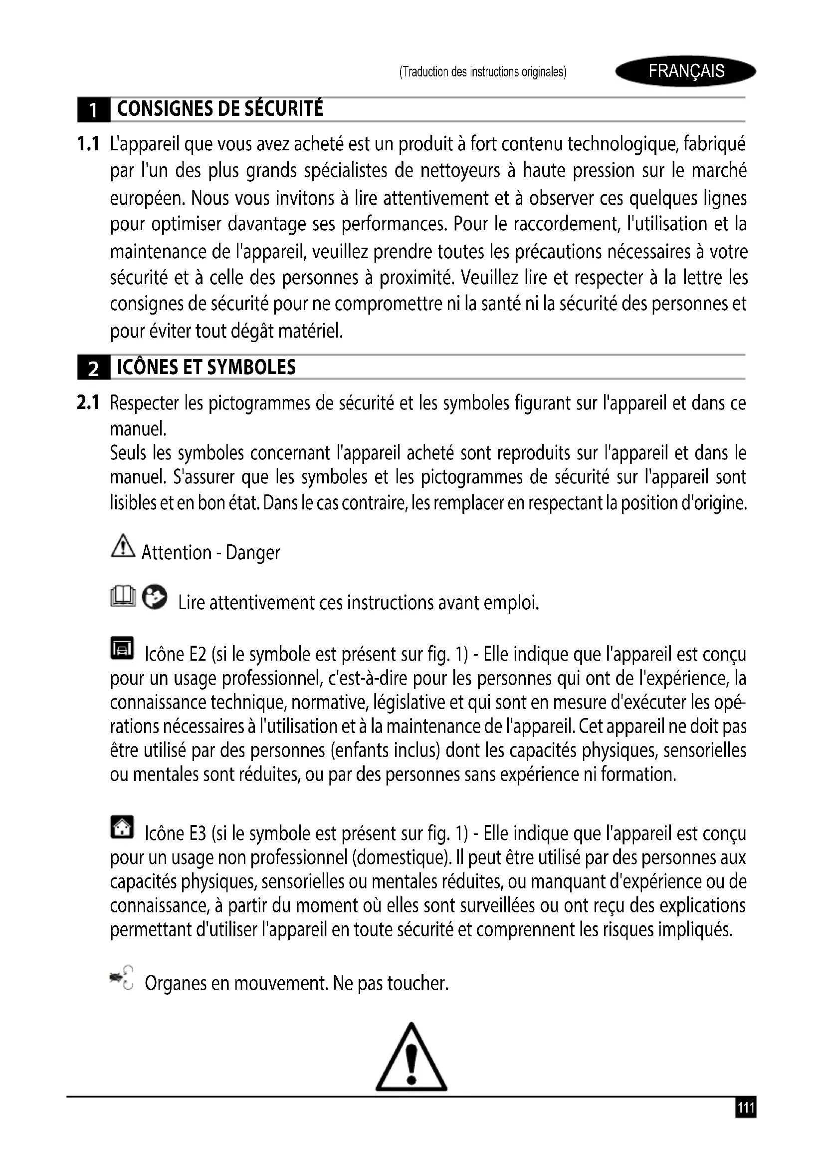 Respecter les pictogrammes de sécurité et les symboles figurant sur l'appareil et dans ce manuel. Seuls les symboles concernant l'appareil acheté sont reproduits sur l'appareil et dans le manuel. S'assurer que les symboles et les pictogrammes de sécurité sur l'appareil sont lisibles et en bon état. Dans le cas contraire, les remplacer en respectant la position d'origine. Attention - Danger Lire attentivement ces instructions avant emploi. Icône E2 (si le symbole est présent sur fig. 1) - Elle indique que l'appareil est conçu pour un usage professionnel, c'est-à-dire pour les personnes qui ont de l'expérience, la connaissance technique, normative, législative et qui sont en mesure d'exécuter les opé