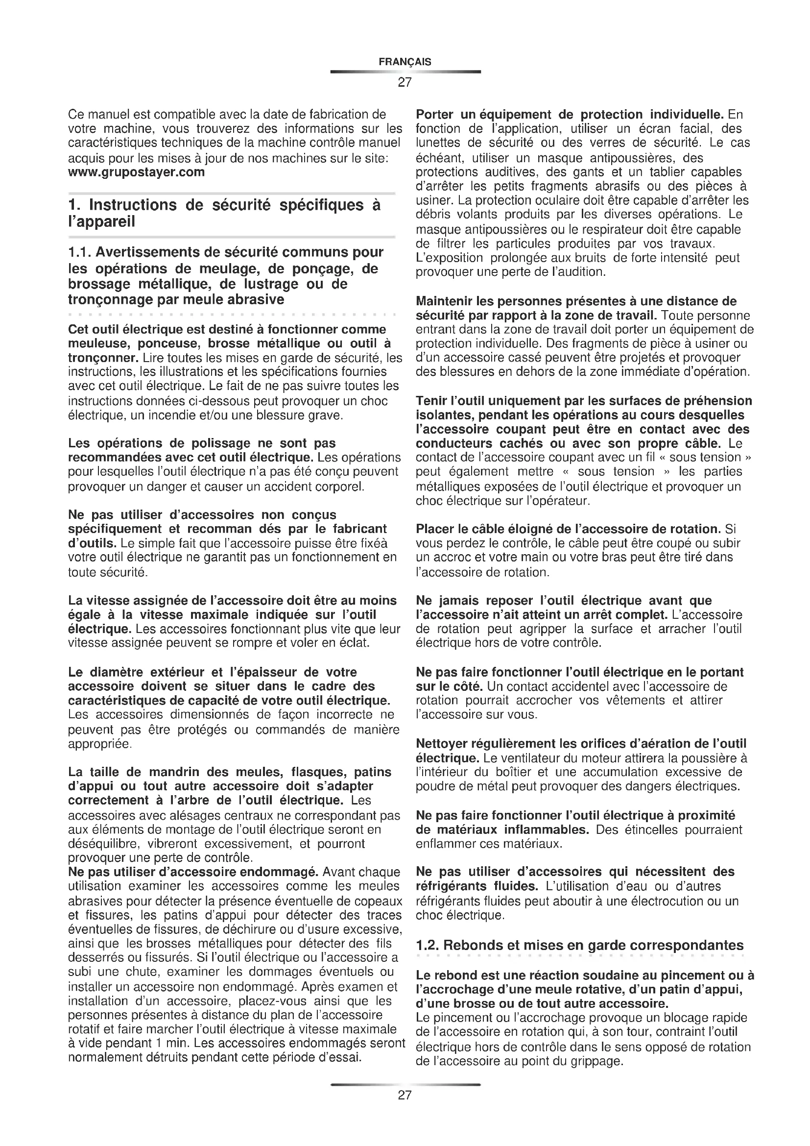 1.3. Mises en garde de sécurité spécifiques aux opérations de meulage et de tronçonnage abrasif