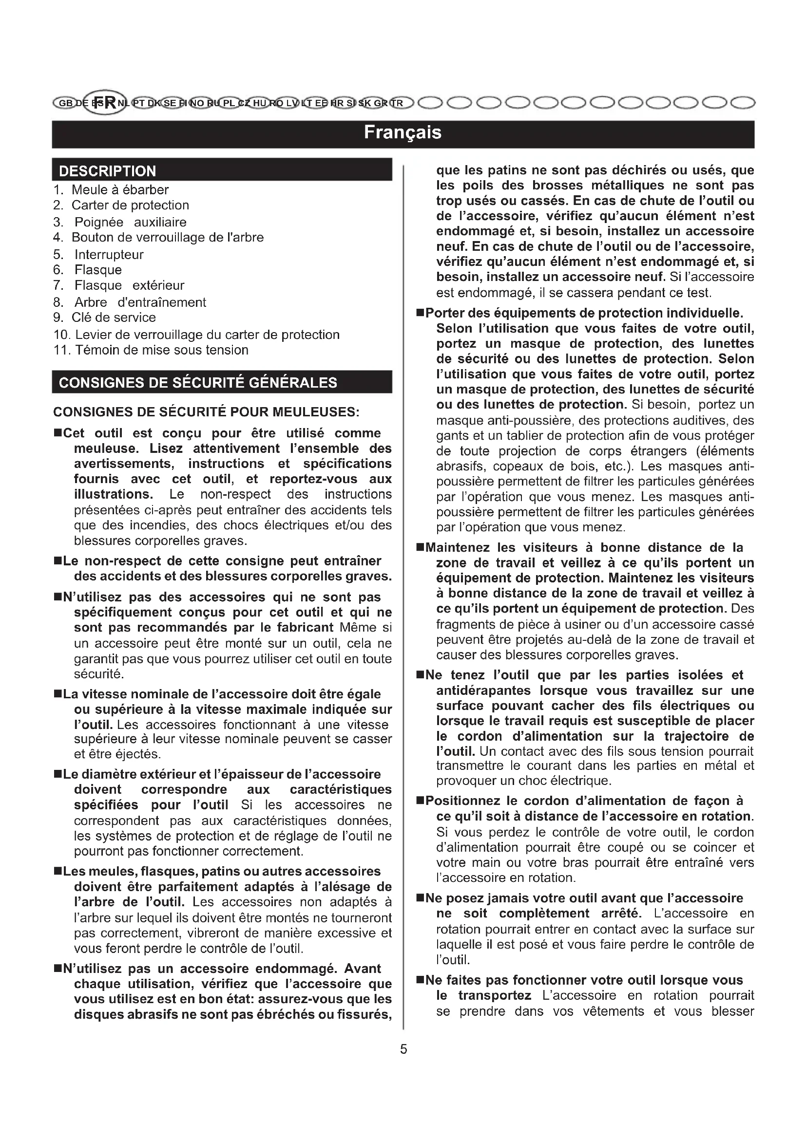 CONSIGNES DE SÉCURITÉ GÉNÉRALES CONSIGNES DE SÉCURITÉ POUR MEULEUSES: Cet outil est conçu pour être utilisé comme meuleuse. Lisez attentivement l’ensemble des avertissements, instructions et spécifications fournis avec cet outil, et reportez-vous aux illustrations. Le non-respect des instructions présentées ci-après peut entraîner des accidents tels que des incendies, des chocs électriques et/ou des blessures corporelles graves. Le non-respect de cette consigne peut entraîner des accidents et des blessures corporelles graves. N’utilisez pas des accessoires qui ne sont pas spécifiquement conçus pour cet outil et qui ne sont pas recommandés par le fabricant Même si un accessoire peut être monté sur un outil, cela ne garantit pas que vous pourrez utiliser cet outil en toute sécurité. La vitesse nominale de l’accessoire doit être égale ou supérieure à la vitesse maximale indiquée sur l’outil. Les accessoires fonctionnant à une vitesse supérieure à leur vitesse nominale peuvent se casser et être éjectés. Le diamètre extérieur et l’épaisseur de l’accessoire doivent correspondre aux caractéristiques spécifiées pour l’outil Si les accessoires ne correspondent pas aux caractéristiques données, les systèmes de protection et de réglage de l’outil ne pourront pas fonctionner correctement. Les meules, flasques, patins ou autres accessoires doivent être parfaitement adaptés à l’alésage de l’arbre de l’outil. Les accessoires non adaptés à l’arbre sur lequel ils doivent être montés ne tourneront pas correctement, vibreront de manière excessive et vous feront perdre le contrôle de l’outil. N’utilisez pas un accessoire endommagé. Avant chaque utilisation, vérifiez que l’accessoire que vous utilisez est en bon état: assurez-vous que les disques abrasifs ne sont pas ébréchés ou fissurés, que les patins ne sont pas déchirés ou usés, que les poils des brosses métalliques ne sont pas trop usés ou cassés. En cas de chute de l’outil ou de l’accessoire, vérifiez qu’aucun élément n’est endommagé et, si besoin, installez un accessoire neuf. En cas de chute de l’outil ou de l’accessoire, vérifiez qu’aucun élément n’est endommagé et, si besoin, installez un accessoire neuf. Si l’accessoire est endommagé, il se cassera pendant ce test. Porter des équipements de protection individuelle. Selon l’utilisation que vous faites de votre outil, portez un masque de protection, des lunettes de sécurité ou des lunettes de protection. Selon l’utilisation que vous faites de votre outil, portez un masque de protection, des lunettes de sécurité ou des lunettes de protection. Si besoin, portez un masque anti-poussière, des protections auditives, des gants et un tablier de protection afin de vous protéger de toute projection de corps étrangers (éléments abrasifs, copeaux de bois, etc.). Les masques anti- poussière permettent de filtrer les particules générées par l’opération que vous menez. Les masques anti- poussière permettent de filtrer les particules générées par l’opération que vous menez. Maintenez les visiteurs à bonne distance de la zone de travail et veillez à ce qu’ils portent un équipement de protection. Maintenez les visiteurs à bonne distance de la zone de travail et veillez à ce qu’ils portent un équipement de protection. Des fragments de pièce à usiner ou d’un accessoire cassé peuvent être projetés au-delà de la zone de travail et causer des blessures corporelles graves. Ne tenez l’outil que par les parties isolées et antidérapantes lorsque vous travaillez sur une surface pouvant cacher des fils électriques ou lorsque le travail requis est susceptible de placer le cordon d’alimentation sur la trajectoire de l’outil. Un contact avec des fils sous tension pourrait transmettre le courant dans les parties en métal et provoquer un choc électrique. Positionnez le cordon d’alimentation de façon à ce qu’il soit à distance de l’accessoire en rotation. Si vous perdez le contrôle de votre outil, le cordon d’alimentation pourrait être coupé ou se coincer et votre main ou votre bras pourrait être entraîné vers l’accessoire en rotation. Ne posez jamais votre outil avant que l’accessoire ne soit complètement arrêté. L’accessoire en rotation pourrait entrer en contact avec la surface sur laquelle il est posé et vous faire perdre le contrôle de l’outil. Ne faites pas fonctionner votre outil lorsque vous le transportez L’accessoire en rotation pourrait se prendre dans vos vêtements et vous blesser6 Français