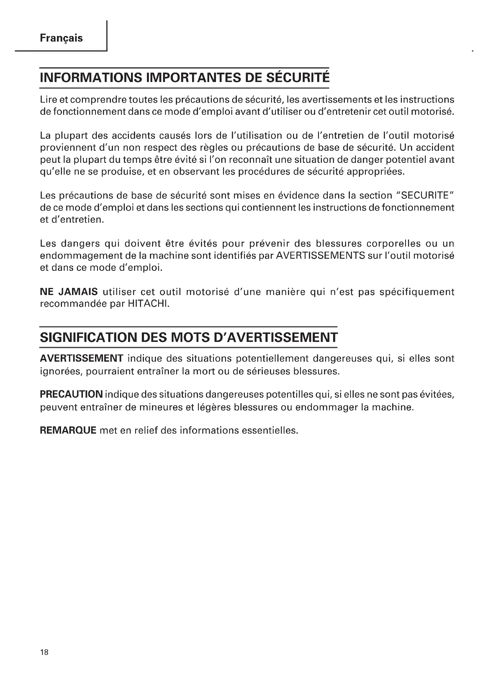 Lire et comprendre toutes les précautions de sécurité, les avertissements et les instructions de fonctionnement dans ce mode d’emploi avant d’utiliser ou d’entretenir cet outil motorisé. La plupart des accidents causés lors de l’utilisation ou de l’entretien de l’outil motorisé proviennent d’un non respect des règles ou précautions de base de sécurité. Un accident peut la plupart du temps être évité si l’on reconnaît une situation de danger potentiel avant qu’elle ne se produise, et en observant les procédures de sécurité appropriées. Les précautions de base de sécurité sont mises en évidence dans la section “SECURITE” de ce mode d’emploi et dans les sections qui contiennent les instructions de fonctionnement et d’entretien. Les dangers qui doivent être évités pour prévenir des blessures corporelles ou un endommagement de la machine sont identifiés par AVERTISSEMENTS sur l’outil motorisé et dans ce mode d’emploi. NE JAMAIS utiliser cet outil motorisé d’une manière qui n’est pas spécifiquement recommandée par HITACHI.