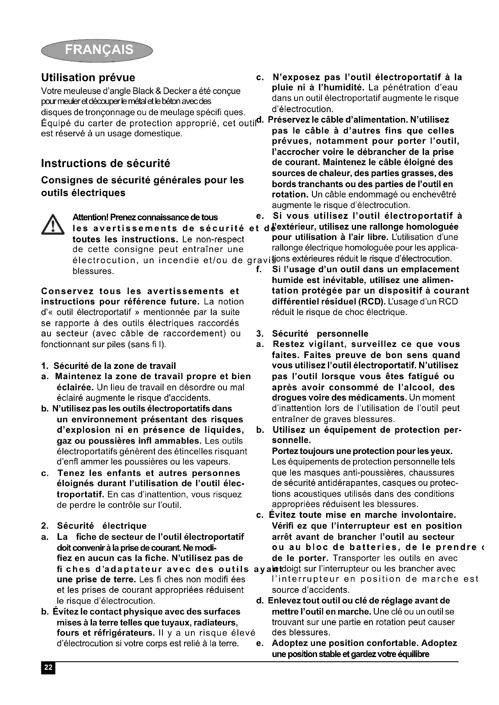 Assemblage Attention! Avant l’assemblage, assurez-vous que l’outil est éteint et débranché. Installation et retrait du carter de protection (fi g. A & B) L’outil est fourni avec un carter de protection réservé à des fi ns de meulage. Si l’unité doit être employée pour des opérations de découpe, un carter de protection spécifi que doit être installé. Un carter de protection pour les opérations de découpe référence 1004484-00 est disponible et peut être obtenu auprès des centres d’entretien Black & Decker. Installation Placez l’outil sur une table, arbre (5) tourné vers le haut. Placez la rondelle à ressort (6) sur l’arbre et engagez-la dans l’épaulement (7). Placez le carter de protection (4) sur l’outil selon le schéma. Placez la bride (8) sur l’arbre avec les lèvres protubérantes dirigées vers le carter. Assurez- vous que les orifi ces de la bride sont alignés avec ceux des vis. Fixez la bride avec les vis (9). Vérifi ez que les vis sont bien serrées et que le carter de protection peut tourner. Retrait Utilisez un tournevis pour enlever les vis (9). Retirez la bride (8), le carter de protection (4) et la rondelle à ressort (7). Rangez ces pièces dans un endroit sûr. Attention! N’utilisez pas l’outil sans carter de protection. Installation de la poignée latérale Vissez la poignée latérale (2) dans l’un des orifi ces de montage de l’outil. Attention! Utilisez toujours la poignée latérale. Installation et retrait des disques de meulage ou de tronçonnage (fi g. C - E) Utilisez toujours le type de disque adapté à votre application. Utilisez toujours des disques présentant un diamètre et un alésage de dimension correcte (voir caractéristiques techniques). Installation Installez le carter de protection comme indiqué ci-dessus. Placez la bride intérieure (10) sur l’arbre (5) comme indiqué (fi g. C). Assurez-vous que la bride est bien en place sur les côtés plats de l’arbre. Placez le disque (11) sur l’arbre (5) comme indiqué (fi g. C). Si le disque comporte un centre surélevé (12), assurezvous qu’il est bien en face de la bride intérieure. Assurez-vous que le disque est bien en place sur la bride intérieure. Placez la bride extérieure (13) sur l’arbre. Lors du montage du disque de meulage, le centre surélevé sur la bride extérieure doit faire face au disque (A dans fi g. D). Lors du montage du disque de tronçonnage, le centre surélevé sur la bride extérieure doit être opposé au disque (B dans fi g. D). Appuyez sur le verrouillage de l’arbre (3) et ser- rez la bride extérieure à l’aide de la clé à deux griffes (14) (fi g. E). Retrait Appuyez sur le verrouillage de l’arbre (3) et desserrez la bride extérieure (13) à l’aide de la clé à deux griffes (14) (fi g. E). Enlevez la bride extérieure (13) et le disque (11). Installation et retrait des disques de ponçage (fi g. E & F) Il est nécessaire d’utiliser un tampon de support pour le ponçage. Vous pouvez vous procurer un tampon de support auprès d’un revendeur Black & Decker. Installation Placez la bride intérieure (10) sur l’arbre (5) comme indiqué (fi g. F). Assurez-vous que la bride est bien en place sur les côtés plats de l’arbre. Placez le tampon de support (15) sur l’arbre. Placez le disque de ponçage (16) sur le tampon de support. Placez la bride extérieure (13) sur l’arbre avec le centre surélevé face opposée à celle du disque. Appuyez sur le verrouillage de l’arbre (3) et ser- rez la bride extérieure à l’aide de la clé à deux griffes (14) (fi g. E). Vérifi ez que la bride extérieure est correctement posée et que le disque est fermement fi xé.28 FRANÇAIS Retrait Appuyez sur le verrouillage de l’arbre (3) et desserrez la bride extérieure (13) à l’aide de la clé à deux griffes (14) (fi g. E). Enlevez la fl asque extérieure (13), le disque de ponçage (16) et le patin de ponçage (15). Risques résiduels L'utilisation d'un outil non mentionné dans les consignes de sécurité données peut entraîner des risques résiduels supplémentaires. Ces risques peuvent survenir si l'outil est mal utilisé, si l'utilisation est prolongée, etc. Malgré l'application des normes de sécurité correspondantes et la présence de dis- positifs de sécurité, les risques résiduels suivants ne peuvent être évités. Ceci comprend : Les blessures dues au contact avec une pièce mobile/ en rotation. Les blessures causées en changeant des pièces, lames ou accessoires. Les blessures dues à l'utilisation prolongée d'un outil. Une utilisation prolongée de l'outil nécessite des pauses régulières. Défi cience auditive. Risques pour la santé causés par l'inhalation de poussières produites pendant l'utilisation de l'outil (exemple : travail avec du bois, surtout le chêne, le Hére et les panneaux en MDF). Utilisation Attention! Laissez l’outil fonctionner à sa propre vitesse. Ne le surchargez pas. Guidez le câble avec soin pour ne pas le couper par mégarde. Attendez-vous à un jet d’étincelles lorsque le disque de meulage ou de tronçonnage touche la pièce à travailler. Placez toujours l’outil de telle sorte que le carter de protection puisse vous protéger au maximum du disque de meulage ou de tronçonnage. Démarrage et arrêt Pour mettre en marche, faites glisser l’interrupteur de marche/arrêt (1) en avant. Vous remarquerez que l’outil continue à fonctionner lorsque vous relâchez l’interrupteur. Pour éteindre, appuyez sur la partie arrière de l’interrupteur de marche/arrêt. Attention! N’éteignez pas l’outil lorsqu’il est encore en charge. Conseils pour une utilisation optimale Tenez l’outil fermement avec une main sur la poignée latérale et l’autre autour de la poignée principale. Lors du meulage, conservez toujours un angle d’environ 15º entre le disque et la surface de la pièce à ouvrer. Entretien Votre appareil/outil Black & Decker avec/san