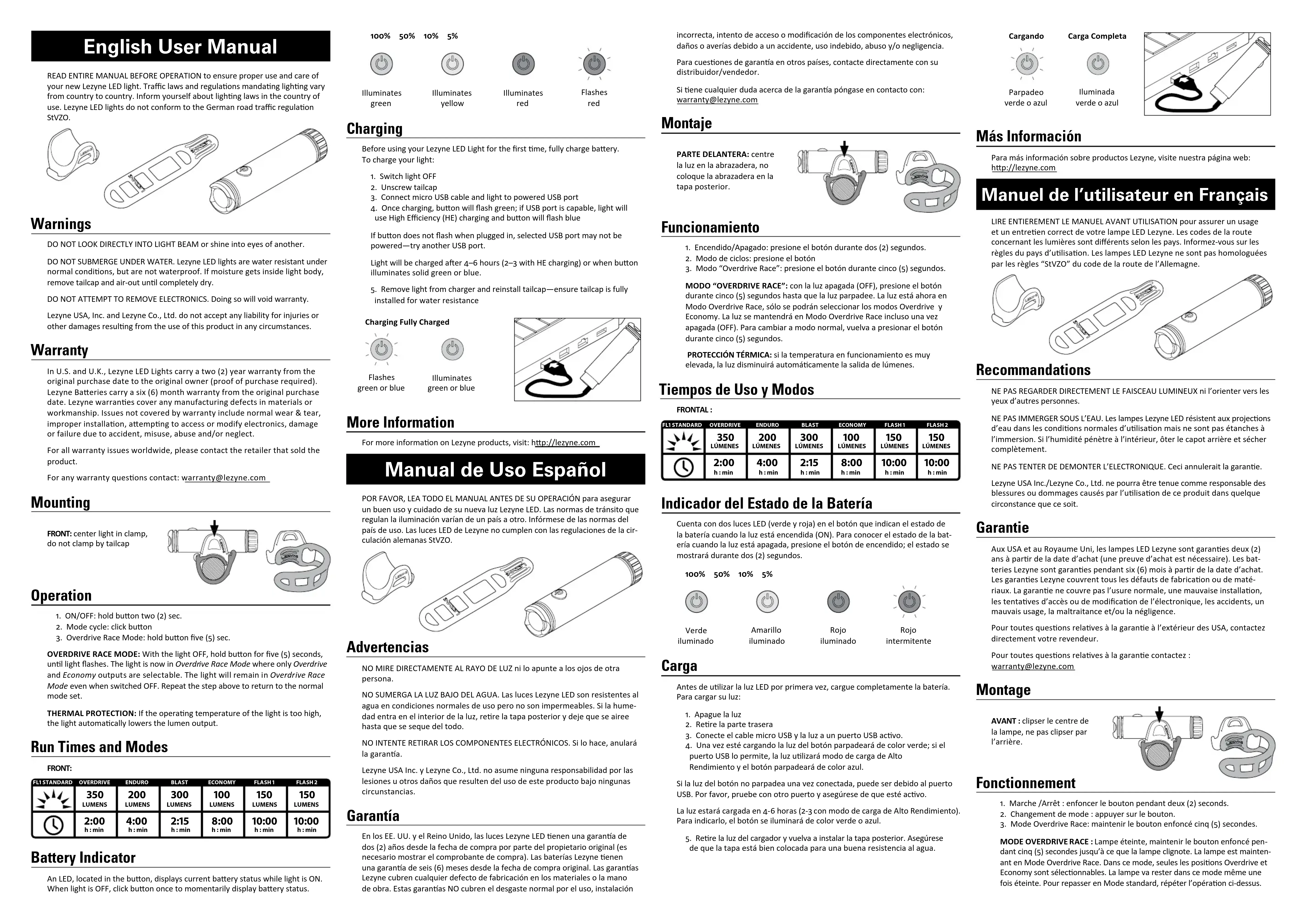 Aux USA et au Royaume Uni, les lampes LED Lezynie sont garanties deux (2) ans par la date de achat (une pretable d'achat est nécessaire). Les batteries Lezynie sont garanties pendant six (6) mois à partir de la date d'achat. L'échaleur des échats de l'achat est généralement attribuée ou de matériaux. La garantie ne couappe pas l'usse normale, une mauvaise installation, les tentatives d'accès ou de modification de l'électronique, les accidents, un mauvais usage, la maltraitance et/ou la néligence.