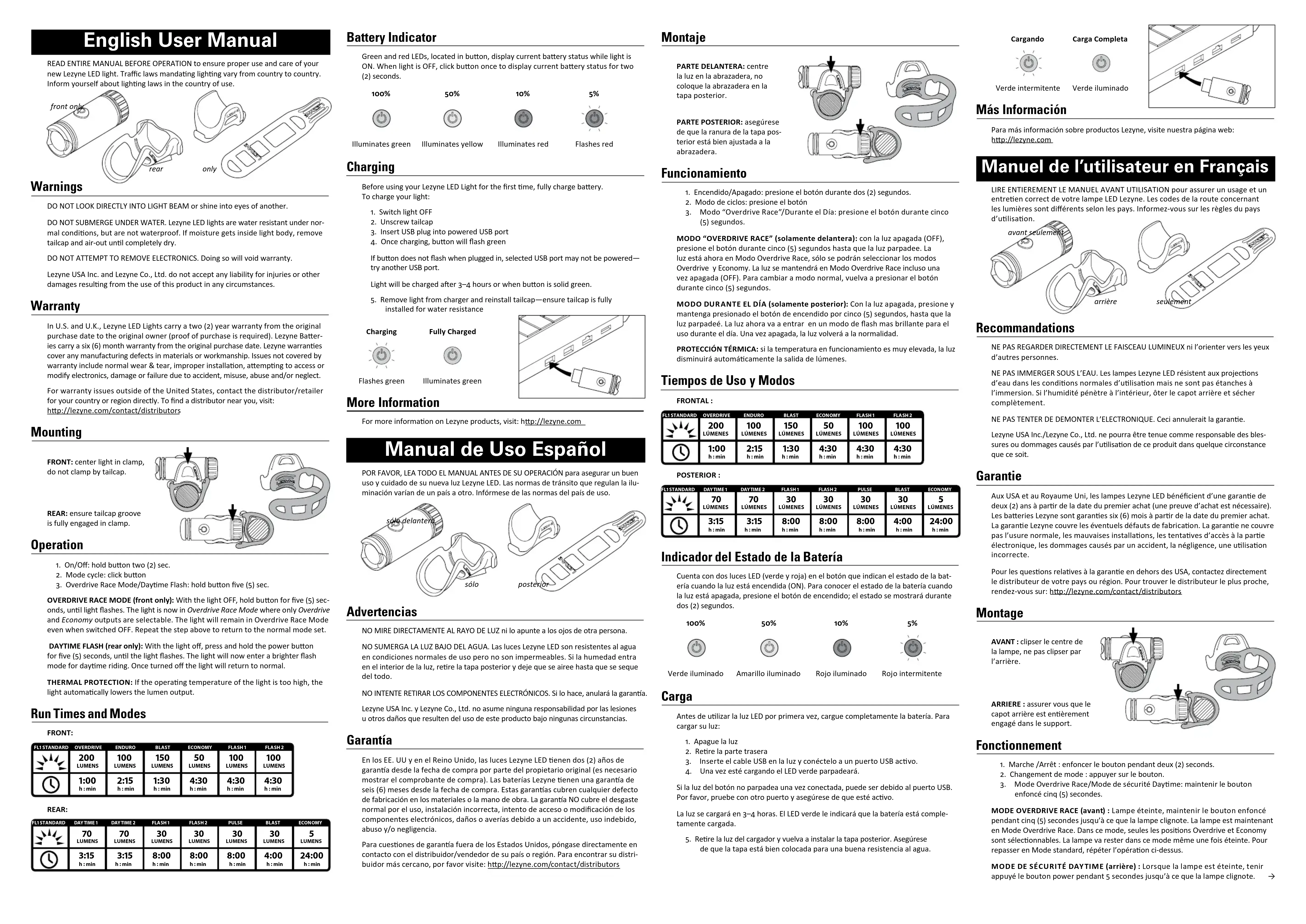 LIRE ETIREMENT LE MANUEL AVANT UTILISATION pour assurer un usage et ur entretien correct de la lampe LED Lezyne. Les codes de la route concernant les lumieres sont différents selon les pays. Informez-vous sur les régles du pays d'utilisation.