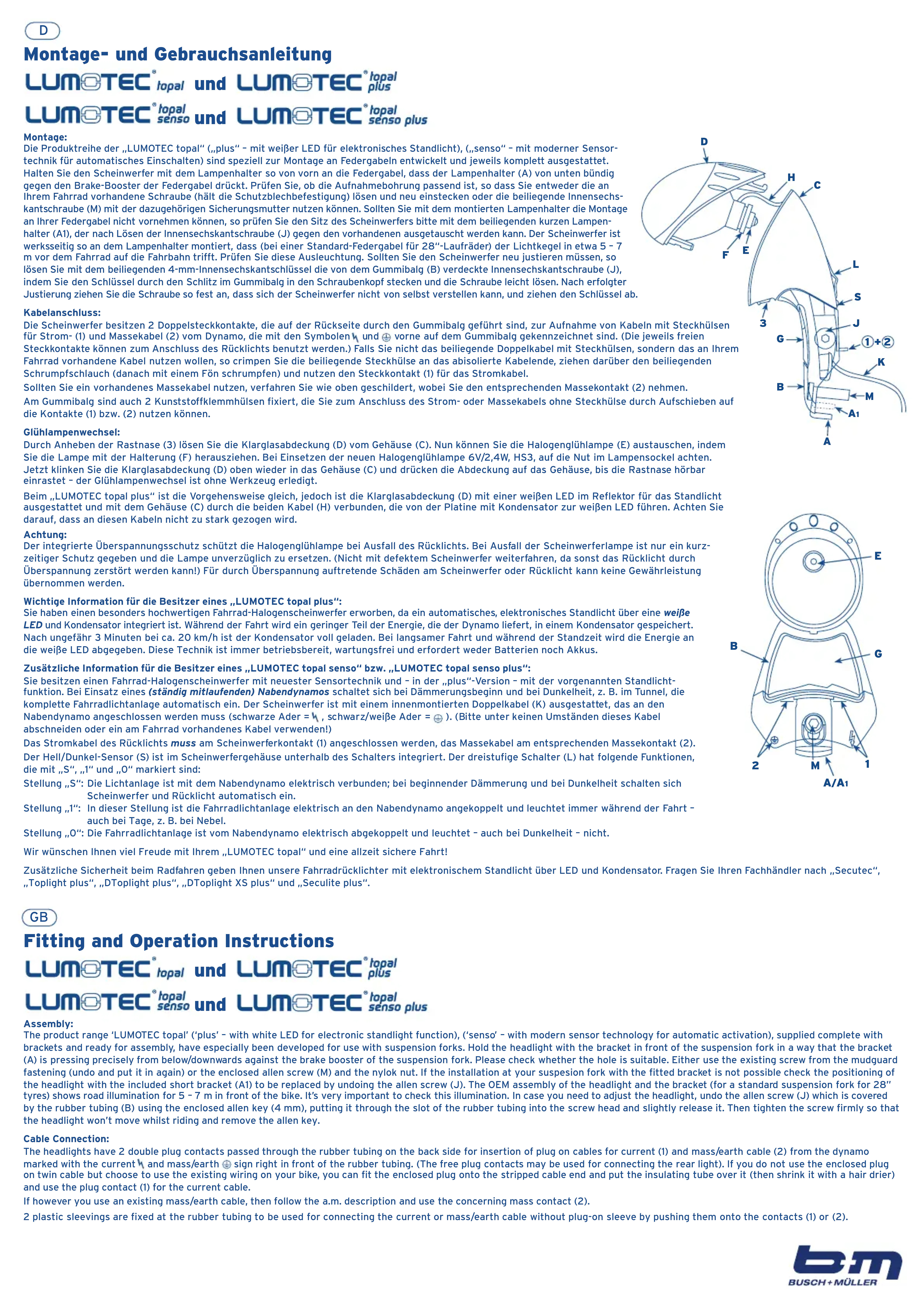 Les gammes de produits « LUMOTEC topal » (« plus » - avec une DEL blanche pour feu de positionlectronique), « senso » - avec une technique de pointe par capteurs, pour la mise en marche automatique), ont ete developedes specialement pour le montage sur des fourches suspends et sont entierement equipees. Maintenez le phare et the pote-lampe a l'avant, contra la fourche suspendue, de telle sorte que le port-lampe (A) vien sappuyer a fleur contre le servofrein de la fourche suspendue. Verifiez si le perage de positionnment ne me permoiit de desserrer la vis existant sur voite bicyclette (celle qui maintainie the gade-boue) et de I'introduire au nouveau, soit dutiliser la vis a six pans creux joine (M) et le contro-ecrou correspondant. Si I installation sur voite fourche suspendue n'est pas possible avec le port-lampe assemblé, essayez I'ajustement du phare avec le port-lampe court (A1) ci-inclus, etre échangé par desserrer la vis a 6 pans creux (J). Le phare est monté à l'usine sur le port-lampe de telle sorte que le pinceau lumineux eclaire la portion de route se trouvant a 5 - 7 m env. devant le velo (avec fourche a suspendue standard pour roules 28^ ). Verifiez si I'clairage est correct. Si you'vea z auveau ajuster le phare, dessrez a l'aide de la clé Allen 4 mm jointe la vis a 6 pans creux (J) dissimulée par le soufflet (B); a cette fin, place z the tete de vis a travers the fente dans the soufflet, et dessrez légerement la vis. Une fois I'ajustage effectué, serrez fermement la vis, de telle sorte que le phare ne risque pas de se déregler de lui-meme par la suite, et otez la clé.