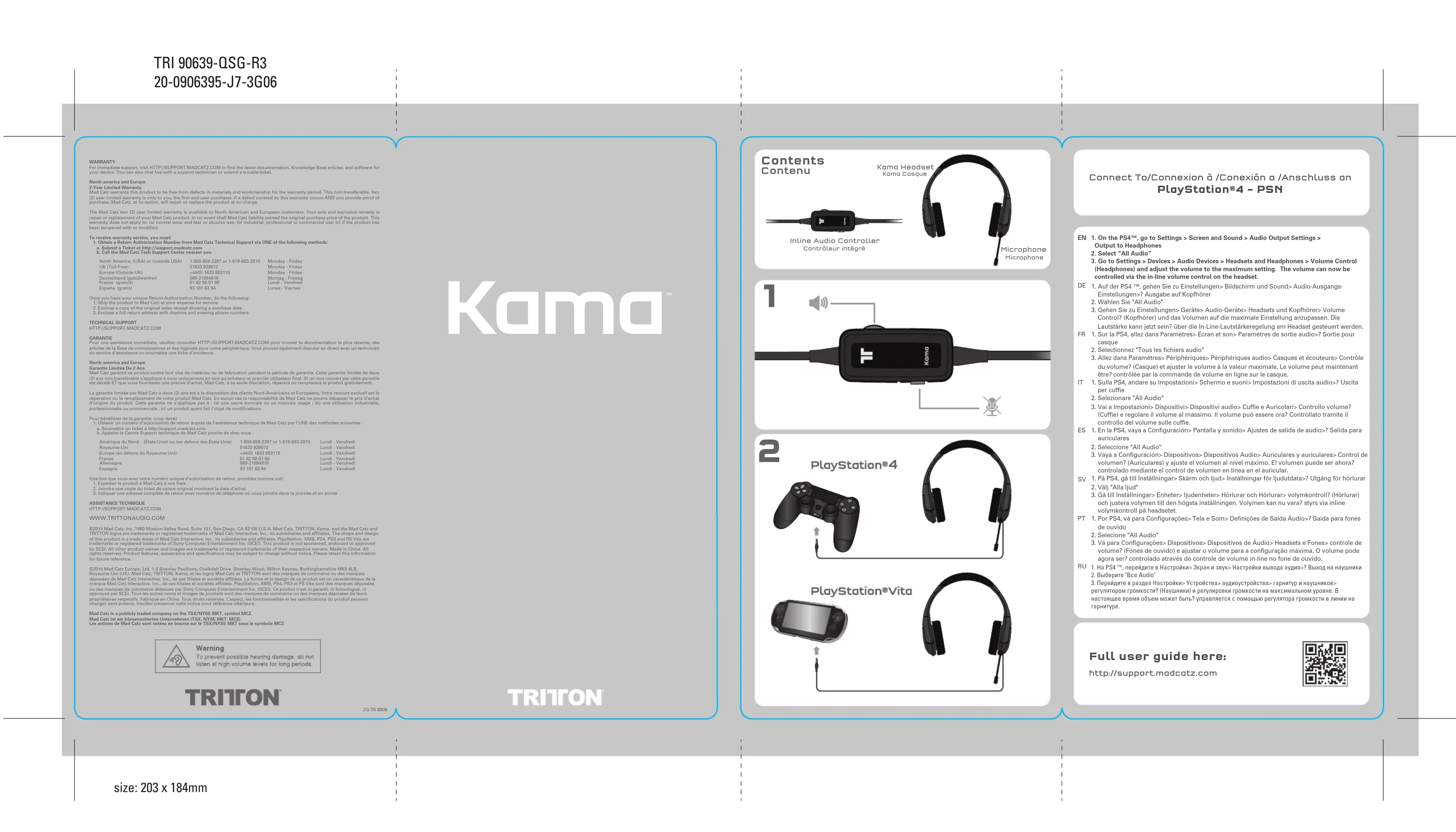 Monday - FridayMonday - FridayMonday - FridayMontag - FreitagLundi - VendrediLunes - Viernes1-800-659-2287 or 1-619-683-2815 01633 928072 +44(0) 1633 883110089-2109481801 82 88 01 80 93 181 63 94North America: (USA) or (outside USA)UK (Toll-Free)Europe (Outside UK)Deutschland (gebührenfrei)France (gratuit) España (gratis)Lundi - VendrediLundi - VendrediLundi - VendrediLundi - VendrediLundi - VendrediLundi - Vendredi1-800-659-2287 or 1-619-683-2815 01633 928072 +44(0) 1633 88311001 82 88 01 80089-21094818 93 181 63 94Amérique du Nord : (États-Unis) ou (en dehors des États-Unis)Royaume-Uni Europe (en dehors du Royaume-Uni) France Allemagne Espagne WARRANTY For immediate support, visit HTTP://SUPPORT.MADCATZ.COM to find the latest documentation, Knowledge Base articles, and software for your device. You can also chat live with a support technician or submit a trouble ticket.North america and Europe2-Year Limited Warranty Mad Catz warrants this product to be free from defects in materials and workmanship for the warranty period. This non-transferable, two (2) year limited warranty is only to you, the first end-user purchaser. If a defect covered by this warranty occurs AND you provide proof of purchase, Mad Catz, at its option, will repair or replace the product at no charge. The Mad Catz two (2) year limited warranty is available to North American and European customers. Your sole and exclusive remedy is repair or replacement of your Mad Catz product. In no event shall Mad Catz liability exceed the original purchase price of the product. This warranty does not apply to: (a) normal wear and tear or abusive use; (b) industrial, professional or commercial use; (c) if the product has been tampered with or modified.To receive warranty service, you must: 1. Obtain a Return Authorization Number from Mad Catz Technical Support via ONE of the following methods: a. Submit a Ticket at http://support.madcatz.com b. Call the Mad Catz Tech Support Center nearest you: Once you have your unique Return Authorization Number, do the following: 1. Ship the product to Mad Catz at your expense for service. 2. Enclose a copy of the original sales receipt showing a purchase date. 3. Enclose a full return address with daytime and evening phone numbers.TECHNICAL SUPPORT HTTP://SUPPORT.MADCATZ.COMGARANTIE Pour une assistance immédiate, veuillez consulter HTTP://SUPPORT.MADCATZ.COM pour trouver la documentation la plus récente, des articles de la Base de connaissances et des logiciels pour votre périphérique. Vous pouvez également discuter en direct avec un technicien du service d’assistance ou soumettre une fiche d’incidence.North america and EuropeGarantie Limitée De 2 Ans Mad Catz garantit ce produit contre tout vice de matériau ou de fabrication pendant la période de garantie. Cette garantie limitée de deux (2) ans non transférable s’applique à vous uniquement en tant qu’acheteur et premier utilisateur final. Si un vice couvert par cette garantie est décelé ET que vous fournissez une preuve d’achat, Mad Catz, à sa seule discrétion, réparera ou remplacera le produit gratuitement. La garantie limitée par Mad Catz à deux (2) ans est à la disposition des clients Nord-Américains et Européens. Votre recours exclusif est la réparation ou le remplacement de votre produit Mad Catz. En aucun cas la responsabilité de Mad Catz ne pourra dépasser le prix d’achat d’origine du produit. Cette garantie ne s’applique pas à : (a) une usure normale ou un mauvais usage ; (b) une utilisation industrielle, professionnelle ou commerciale ; (c) un produit ayant fait l’objet de modifications.Pour bénéficier de la garantie, vous devez : 1. Obtenir un numéro d'autorisation de retour auprès de l’assistance technique de Mad Catz par l'UNE des méthodes suivantes : a. Soumettre un ticket à http://support.madcatz.com b. Appelez le Centre Support technique de Mad Catz proche de chez vous :Une fois que vous avez votre numéro unique d'autorisation de retour, procédez comme suit: 1. Expédier le produit à Mad Catz à vos frais. 2. Joindre une copie du ticket de caisse original montrant la date d’achat. 3. Indiquer une adresse complète de retour avec numéros de téléphone où vous joindre dans la journée et en soiréeASSISTANCE TECHNIQUEHTTP://SUPPORT.MADCATZ.COMWWW.TRITTONAUDIO.COM ©2014 Mad Catz, Inc. 7480 Mission Valley Road, Suite 101, San Diego, CA 92108 U.S.A. Mad Catz, TRITTON, Kama, and the Mad Catz and TRITTON logos are trademarks or registered trademarks of Mad Catz Interactive, Inc., its subsidiaries and affiliates. The shape and design of this product is a trade dress of Mad Catz Interactive, Inc., its subsidiaries and affiliates. PlayStation, XMB, PS4, PS3 and PS Vita are trademarks or registered trademarks of Sony Computer Entertainment Inc. (SCEI). This product is not sponsored, endorsed or approved by SCEI. All other product names and images are trademarks or registered trademarks of their respective owners. Made in China. All rights reserved. Product features, appearance and specifications may be subject to change without notice. Please retain this information for future reference. ©2014 Mad Catz Europe, Ltd. 1-2 Shenley Pavilions, Chalkdell Drive. Shenley Wood, Milton Keynes, Buckinghamshire MK5 6LB, Royaume-Uni (UK). Mad Catz, TRITTON, Kama, et les logos Mad Catz et TRITTON sont des marques de commerce ou des marques déposées de Mad Catz Interactive, Inc., de ses filiales et sociétés affiliées. La forme et le design de ce produit est un caractéristique de la marque Mad Catz Interactive, Inc., de ses filiales et sociétés affiliées. PlayStation, XMB, PS4, PS3 et PS Vita sont des marques déposées ou des marques de commerce détenues par Sony Computer Entertainment Inc. (SCEI). Ce produit n’est ni garanti, ni homologué, ni approuvé par SCEI. Tous les autres noms et images de produits sont des marques de commerce ou des marques déposées de leurs propriét
