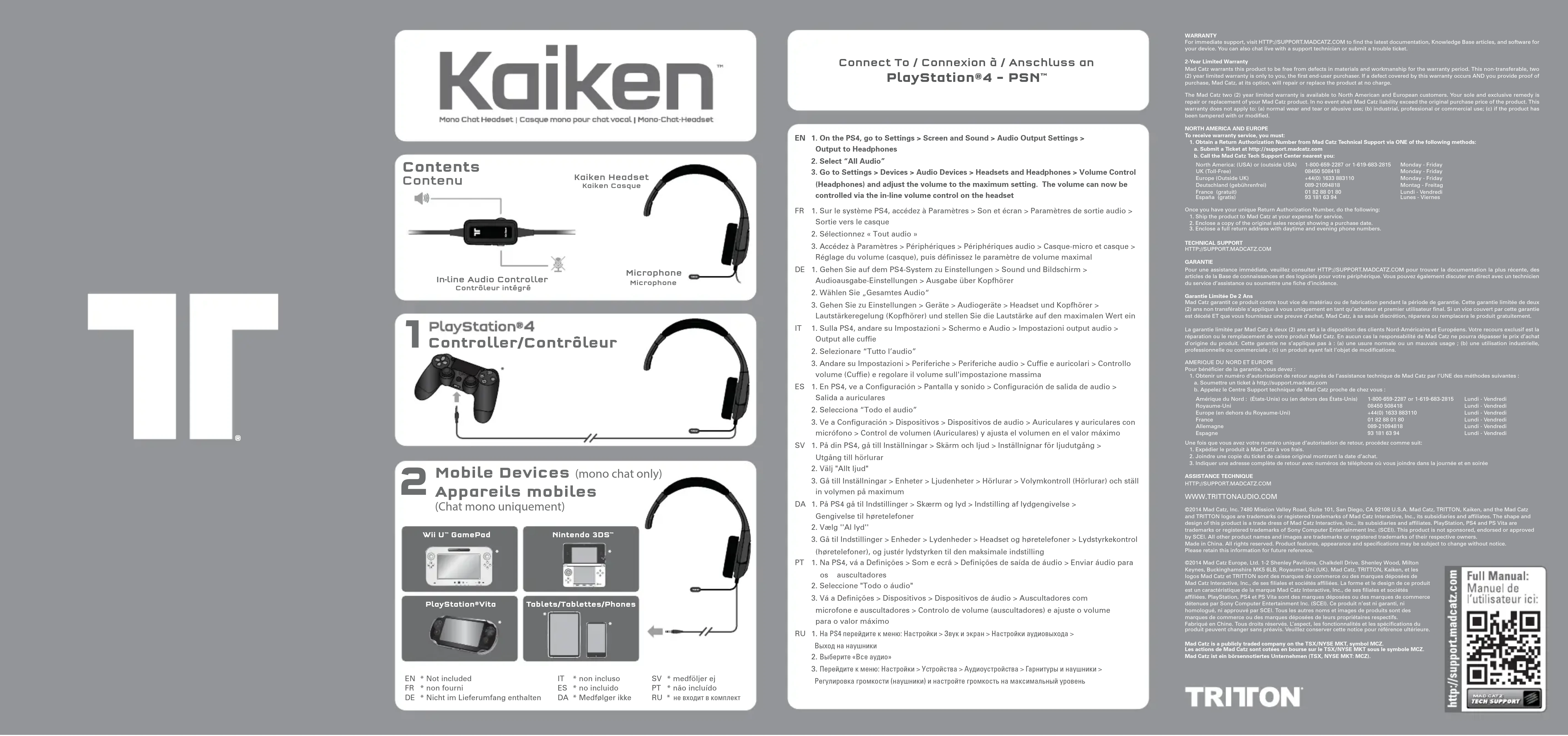 ©2014 Mad Catz, Inc. 7480 Mission Valley Road, Suite 101, San Diego, CA 92108 U.S.A. Mad Catz, TRITTON, Kaiken, and the Mad Catz and TRITTON logos are trademarks or registered trademarks of Mad Catz Interactive, Inc., its subsidiaries and affiliates. The shape and design of this product is a trade dress of Mad Catz Interactive, Inc., its subsidiaries and affiliates. PlayStation, PS4 and PS Vita are trademarks or registered trademarks of Sony Computer Entertainment Inc. (SCEI). This product is not sponsored, endorsed or approved by SCEI. All other product names and images are trademarks or registered trademarks of their respective owners. Made in China. All rights reserved. Product features, appearance and specifications may be subject to change without notice. Please retain this information for future reference. ©2014 Mad Catz Europe, Ltd. 1-2 Shenley Pavilions, Chalkdell Drive. Shenley Wood, Milton Keynes, Buckinghamshire MK5 6LB, Royaume-Uni (UK). Mad Catz, TRITTON, Kaiken, et les logos Mad Catz et TRITTON sont des marques de commerce ou des marques déposées de Mad Catz Interactive, Inc., de ses filiales et sociétés affiliées. La forme et le design de ce produit est un caractéristique de la marque Mad Catz Interactive, Inc., de ses filiales et sociétés affiliées. PlayStation, PS4 et PS Vita sont des marques déposées ou des marques de commerce détenues par Sony Computer Entertainment Inc. (SCEI). Ce produit n’est ni garanti, ni homologué, ni approuvé par SCEI. Tous les autres noms et images de produits sont des marques de commerce ou des marques déposées de leurs propriétaires respectifs. Fabriqué en Chine. Tous droits réservés. L’aspect, les fonctionnalités et les spécifications du produit peuvent changer sans préavis. Veuillez conserver cette notice pour référence ultérieure. Mad Catz is a publicly traded company on the TSX/NYSE MKT, symbol MCZ. Les actions de Mad Catz sont cotées en bourse sur le TSX/NYSE MKT sous le symbole MCZ. Mad Catz ist ein börsennotiertes Unternehmen (TSX, NYSE MKT: MCZ). Controller/Contrôleur