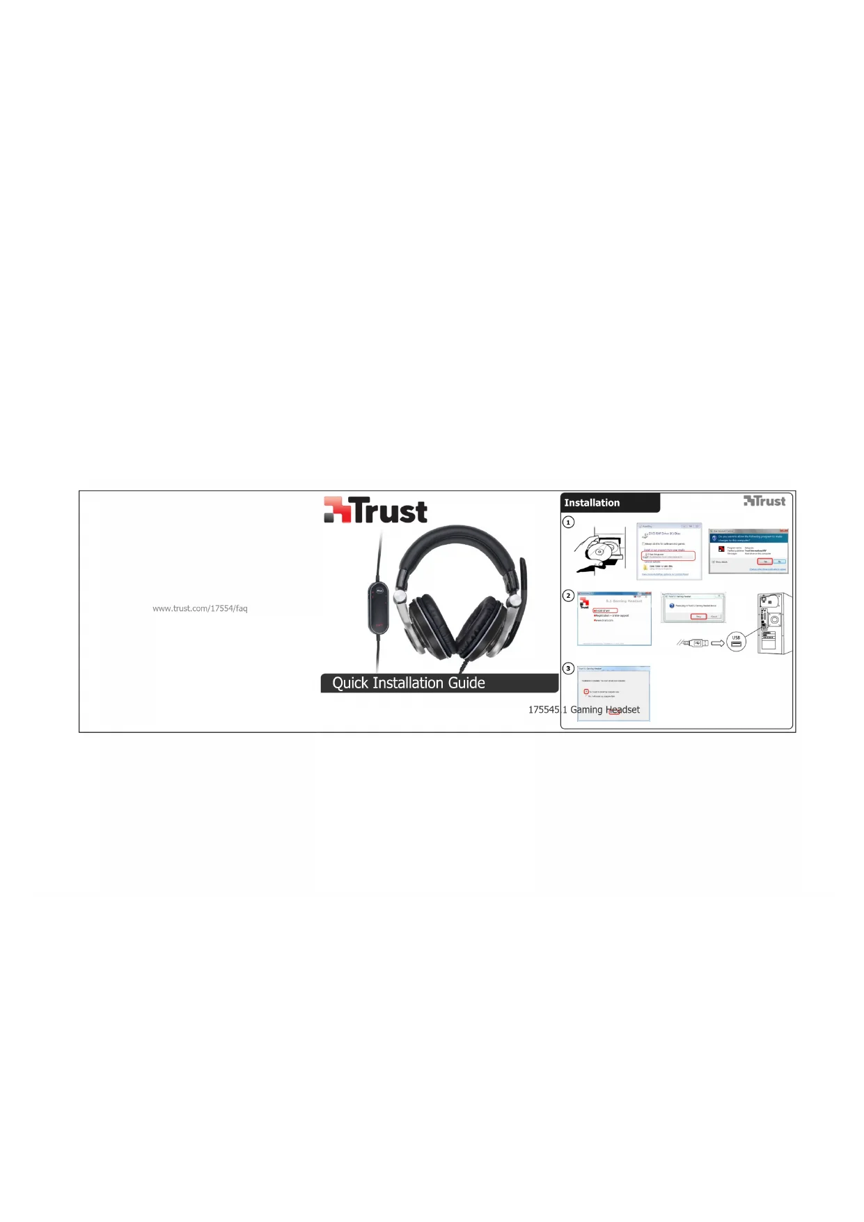 Insérez le CD-Rom Trust dans votre lecteur de CD. Cliquez sur “Run Setup.exe – Published by Trust International BV”. Si le message de vérification du compte apparaît, cliquez sur “Yes” (Oui). Cliquez sur “Install driver” dans le menu d'installation Trust. Branchez le casque ( lorsque vous y êtes invité). Cliquez sur “Retry”. L'installation est terminée : cliquez sur “Finish” pour redémarrer votre ordinateur. (Si vous n'avez pas sauvegardé tous vos documents et fichiers, sélectionnez “No, I will restart my computer later”, puis cliquez sur “Finish” pour redémarrer votre ordinateur plus tard)