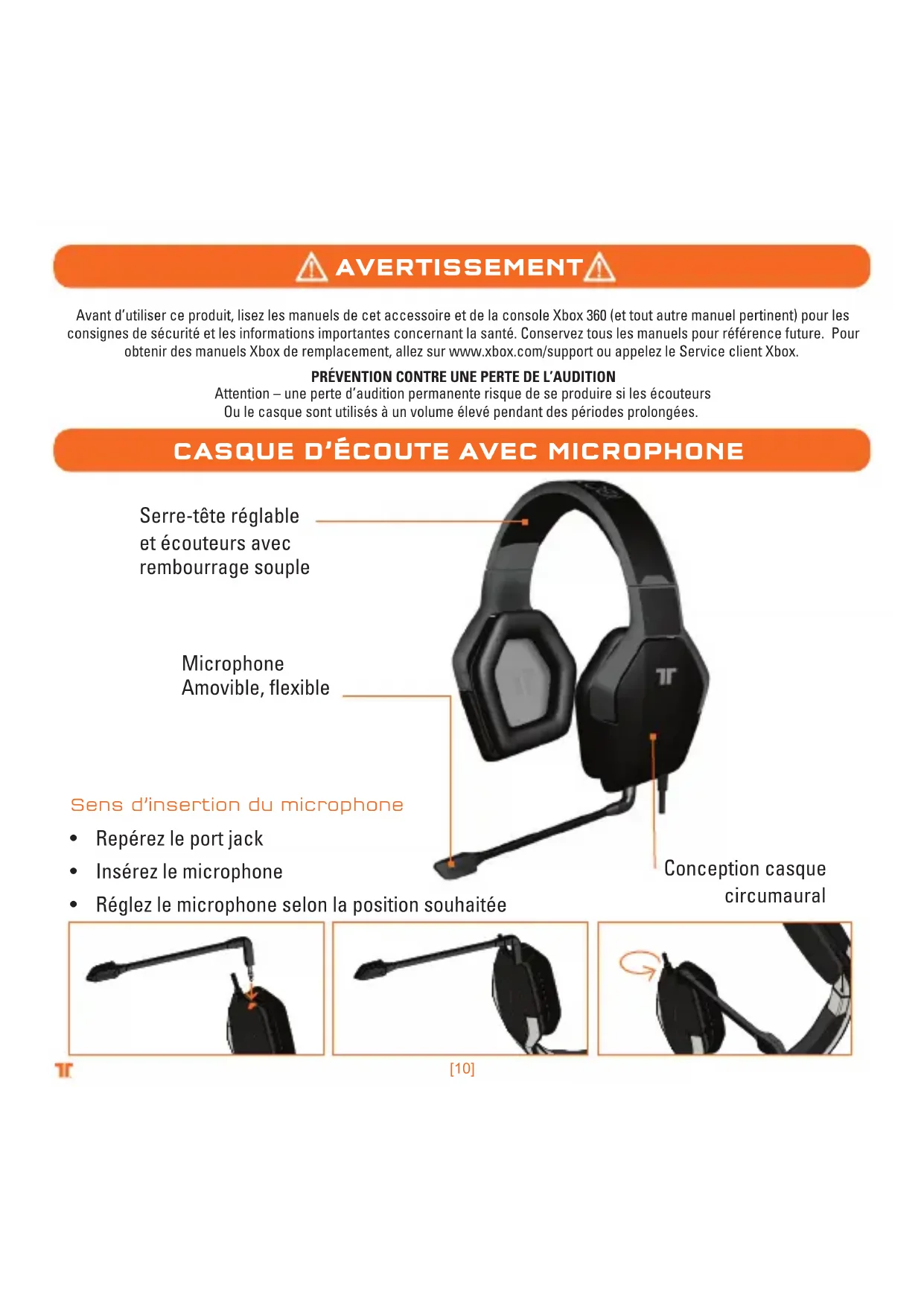 Avant d’utiliser ce produit, lisez les manuels de cet accessoire et de la console Xbox 360 (et tout autre manuel pertinent) pour les consignes de sécurité et les informations importantes concernant la santé. Conservez tous les manuels pour référence future. Pour obtenir des manuels Xbox de remplacement, allez sur www.xbox.com/support ou appelez le Service client Xbox. PRÉVENTION CONTRE UNE PERTE DE L’AUDITION Attention – une perte d’audition permanente risque de se produire si les écouteurs Ou le casque sont utilisés à un volume élevé pendant des périodes prolongées.FRANÇAIS [11]