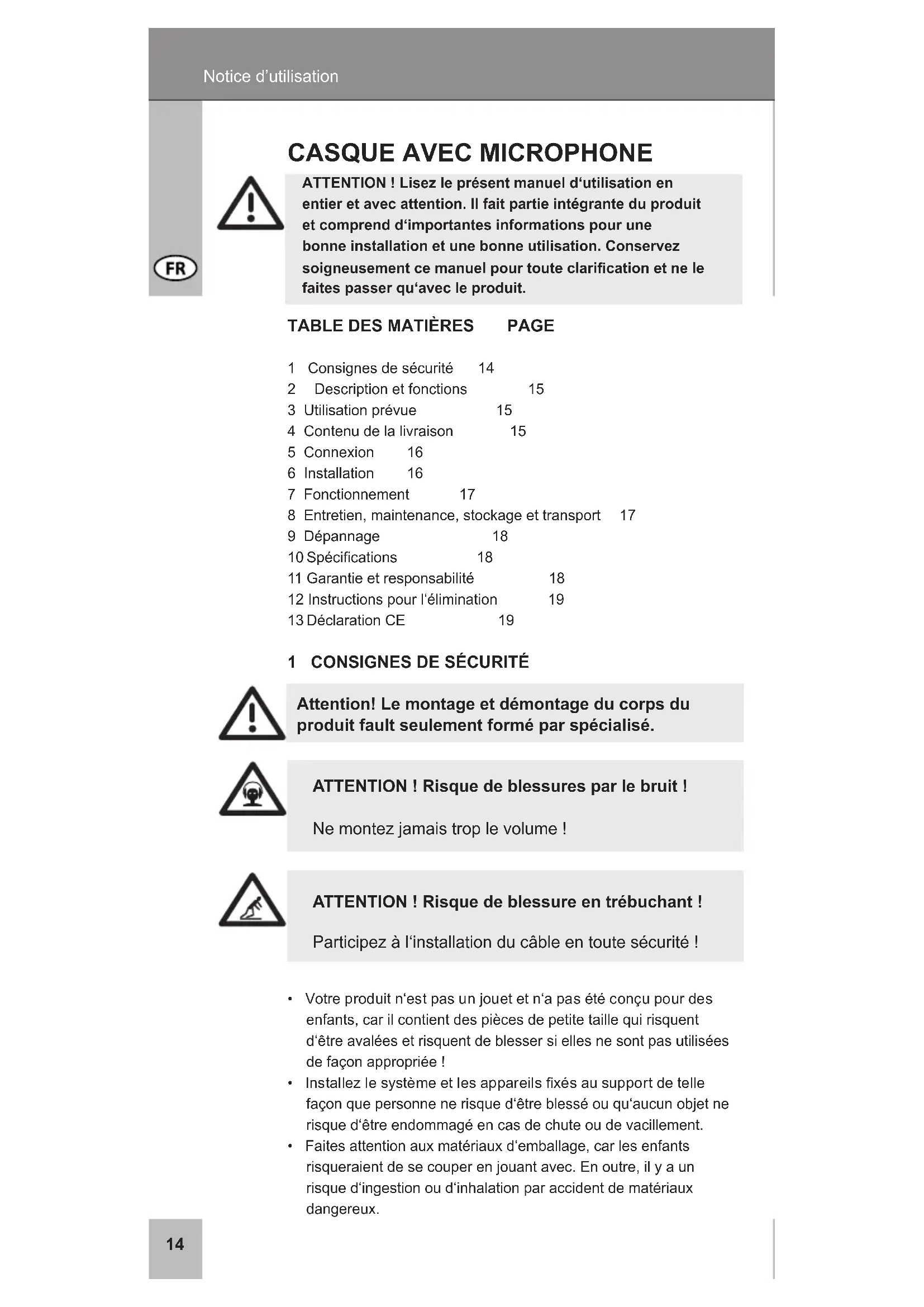 - Faitesattentionauxmatériauxd‘emballage,carlesenfants risqueraientdesecouperenjouantavec.Enoutre,ilyaun risqued‘ingestionoud‘inhalationparaccidentdematériaux dangereux. ATTENTION ! Risque de blessure en trébuchant ! Participezàl‘installationducâbleentoutesécurité! ATTENTION ! Risque de blessures par le bruit ! Nemontezjamaistroplevolume!15 2 deSCRIPTION eT FONCTIONS Votreproduitestuncasqueuniverselpourunusagemultimédia. Envoyezetrecevezdessignauxaudioaveclecasquestéréoetle microphoneintégré.Réglezleproduitindividuellementselonl‘utilisateur. Leproduitestfaitpourlesappelstéléphoniquesetvidéoavec l‘ordinateur,pourlesjeuxetpourécouterdelamusique. 3 UTILISATION PRéVUe Nousn‘autorisonspasl‘utilisationdel‘appareild‘unefaçonautreque celledécritedanslechapitreDescriptionetfonctionsUtilisezleproduit uniquementdansleslocauxintérieurssecs.Lefaitdenepasrespecter cesrèglementationsoulesconsignesdesécuritépeutprovoquerdes accidentsmortels,desblessuresetdesdommagesauxpersonneset auxbiens. 4 CONTeNU de LA LIVRAISON