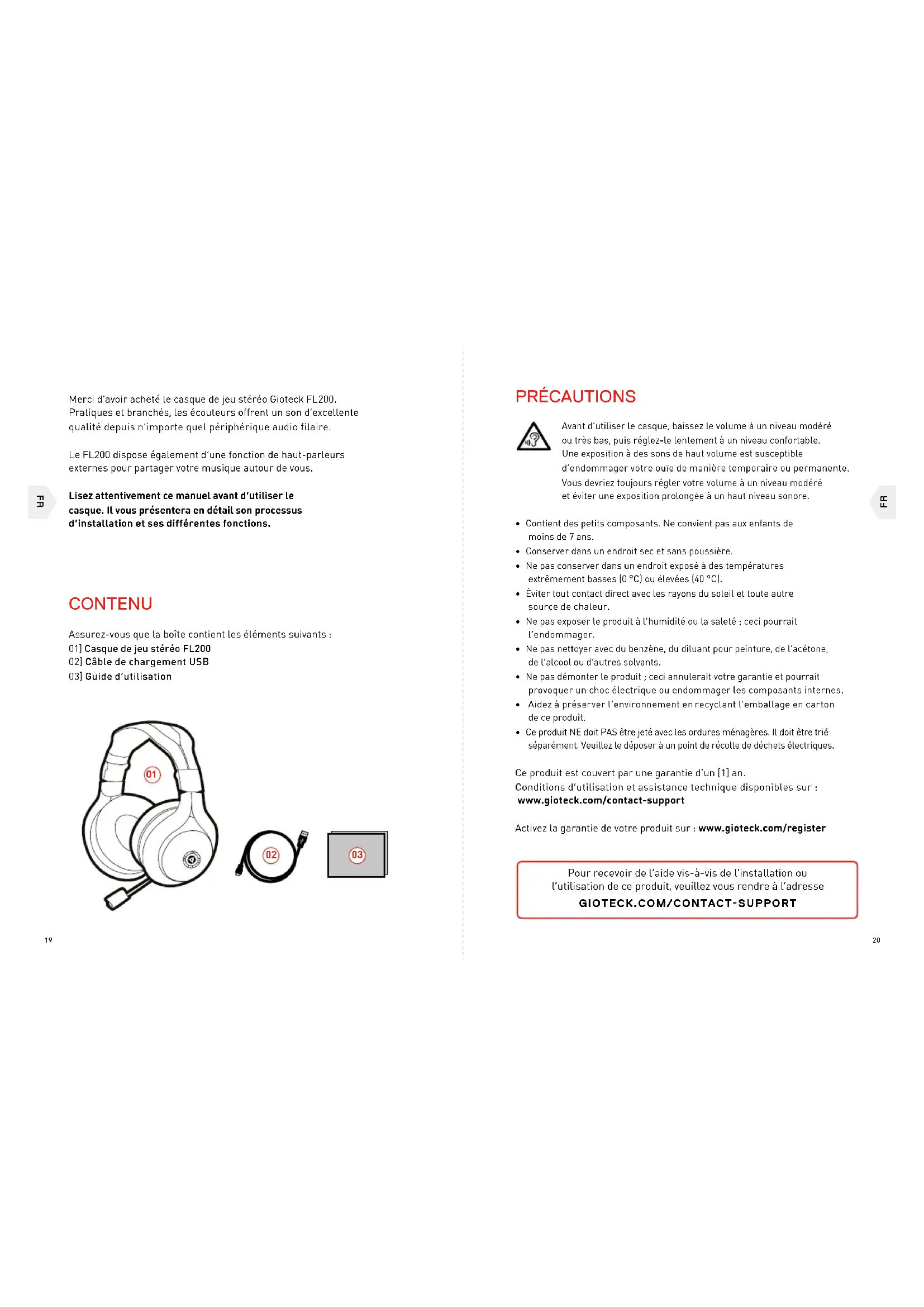 Merci d’avoir acheté le casque de jeu stéréo Gioteck FL200. Pratiques et branchés, les écouteurs offrent un son d’excellente qualité depuis n’importe quel périphérique audio filaire. Le FL200 dispose également d’une fonction de haut-parleurs externes pour partager votre musique autour de vous. Lisez attentivement ce manuel avant d’utiliser le casque. Il vous présentera en détail son processus d’installation et ses différentes fonctions. CONTENU Assurez-vous que la boîte contient les éléments suivants : 01] Casque de jeu stéréo FL200 02] Câble de chargement USB 03] Guide d’utilisation Avant d’utiliser le casque, baissez le volume à un niveau modéré ou très bas, puis réglez-le lentement à un niveau confortable. Une exposition à des sons de haut volume est susceptible d’endommager votre ouïe de manière temporaire ou permanente. Vous devriez toujours régler votre volume à un niveau modéré et éviter une exposition prolongée à un haut niveau sonore.
