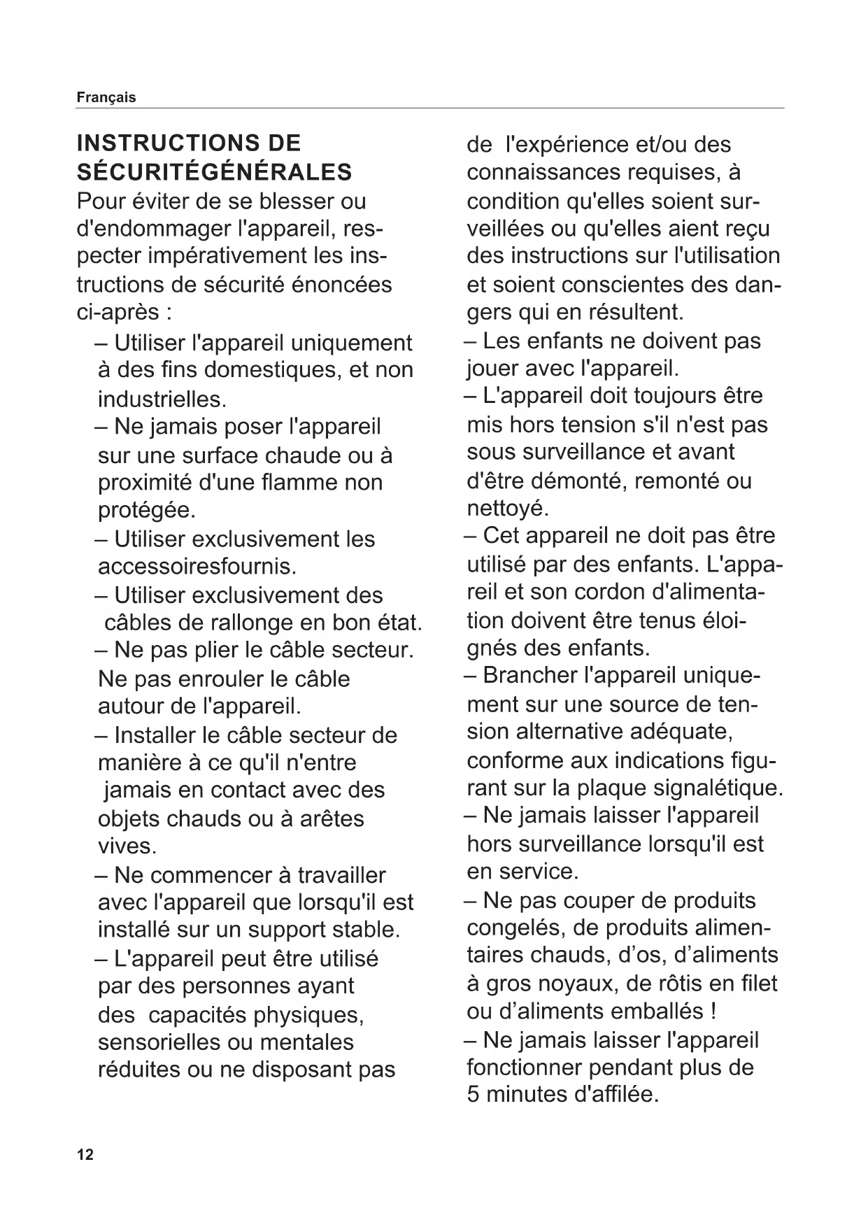 Pour éviter de se blesser ou d'endommager l'appareil, res- pecter impérativement les ins- tructions de sécurité énoncées ci-après : – Utiliser l'appareil uniquement à des ns domestiques, et non industrielles. – Ne jamais poser l'appareil sur une surface chaude ou à proximité d'une amme non protégée. – Utiliser exclusivement les accessoires fournis. – Utiliser exclusivement des câbles de rallonge en bon état. – Ne pas plier le câble secteur. Ne pas enrouler le câble autour de l'appareil. – Installer le câble secteur de manière à ce qu'il n'entre jamais en contact avec des objets chauds ou à arêtes vives. – Ne commencer à travailler avec l'appareil que lorsqu'il est installé sur un support stable. – L'appareil peut être utilisé par des personnes ayant des capacités physiques, sensorielles ou mentales réduites ou ne disposant pas de l'expérience et/ou des connaissances requises, à condition qu'elles soient sur- veillées ou qu'elles aient reçu des instructions sur l'utilisation et soient conscientes des dan- gers qui en résultent. – Les enfants ne doivent pas jouer avec l'appareil. – L'appareil doit toujours être mis hors tension s'il n'est pas sous surveillance et avant d'être démonté, remonté ou nettoyé. – Cet appareil ne doit pas être utilisé par des enfants. L'appa- reil et son cordon d'alimenta- tion doivent être tenus éloi- gnés des enfants. – Brancher l'appareil unique- ment sur une source de ten- sion alternative adéquate, conforme aux indications gu- rant sur la plaque signalétique. – Ne jamais laisser l'appareil hors surveillance lorsqu'il est en service. – Ne pas couper de produits congelés, de produits alimen- taires chauds, d’os, d’aliments à gros noyaux, de rôtis en let ou d’aliments emballés ! – Ne jamais laisser l'appareil fonctionner pendant plus de 5 minutes d'alée. Français13 Risque de décharge électrique – Débrancher toujours la che secteur de la prise de courant en cas de panne, avant de nettoyer l'appareil ou lorsqu'il n'est pas utilisé. Tirer sur la che et non sur le câble. – Ne jamais plonger l'appareil dans l'eau. Ne pas expo- ser l'appareil à la pluie ou à d'autres sources d'humidité. Si l'appareil devait toutefois tomber dans l'eau, débran- cher d'abord la che secteur de la prise de courant, puis sortir l'appareil de l'eau. Faire ensuite vérier l'appareil dans un centre de service après-vente agréé avant de le remettre en marche. – Ne jamais utiliser l'appareil avec des mains humides. Ne pas l'employer lorsqu'il est humide ou mouillé, ou si vous vous trouvez sur un sol humide. Ne pas utiliser l'appareil en plein air. – Cesser aussitôt d'utiliser l'appareil lorsque certains de ses éléments sont endom- magés et contacter le service après-vente ritter. – Si le câble secteur est endom- magé, il doit être remplacé par le fabricant, son service après-vente ou une personne disposant de la qualication requise, an d'exclure tout risque. Risques de blessures – Ne pas utiliser cet appareil sans chariot ou pousse-restes, à moins que la taille et la forme du produit à trancher ne le permettent. – Mettre l'appareil hors tension et le débrancher avant de remplacer des accessoires ou des pièces mobiles en cours de fonctionnement. – La lame est très coupante. – En cours de fonctionnement, ne jamais toucher la lame ! – Avant de nettoyer l'appa- reil, le mettre hors tension, débrancher la che secteur de la prise de courant et placer le bouton de réglage de l'épaisseur de coupe en position « 0 ». – La lame continue de tourner quelques instants après la mise hors tension. Français14 Déplier les graphiques qui se trouvent dans la partie avant et arrière au dos du manuel. Lire attentivement le mode d'emploi avant la mise en service de l'appareil. Conserver le mode d'emploi et le laisser avec l'appa- reil lorsque celui-ci est vendu. La dernière version du mode d'emploi est également disponible sous www.ritterwerk.de. USAGE CONFORME La trancheuse universelle permet de couper les produits alimen- taires à usage domestique. La trancheuse universelle est conçue pour le contact avec les denrées alimentaires. Une utilisation non conforme ou inadaptée peut être à l'origine de graves blessures ou endom- mager l'appareil. Les clauses de garantie et la responsabilité du fabricant n'ont plus cours de validité dans ce cas.