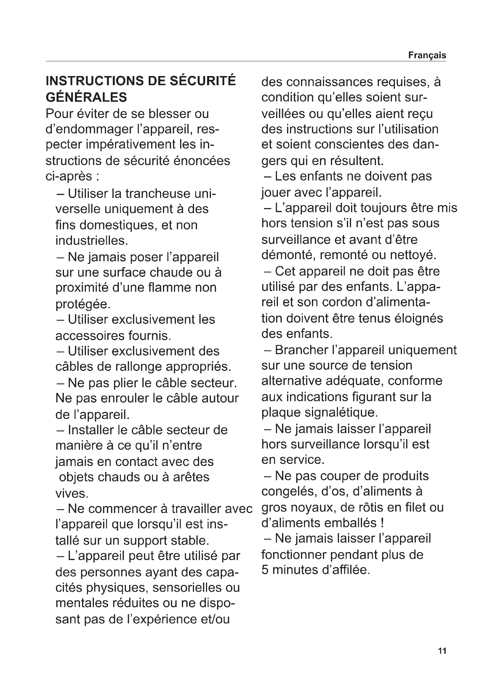 Pour éviter de se blesser ou d’endommager l’appareil, res- pecter impérativement les in- structions de sécurité énoncées ci-après : – Utiliser la trancheuse uni- verselle uniquement à des ns domestiques, et non industrielles. – Ne jamais poser l’appareil sur une surface chaude ou à proximité d’une amme non protégée. – Utiliser exclusivement les accessoires fournis. – Utiliser exclusivement des câbles de rallonge appropriés. – Ne pas plier le câble secteur. Ne pas enrouler le câble autour de l’appareil. – Installer le câble secteur de manière à ce qu’il n’entre jamais en contact avec des objets chauds ou à arêtes vives. – Ne commencer à travailler avec l’appareil que lorsqu’il est ins- tallé sur un support stable. – L’appareil peut être utilisé par des personnes ayant des capa- cités physiques, sensorielles ou mentales réduites ou ne dispo- sant pas de l’expérience et/ou des connaissances requises, à condition qu’elles soient sur- veillées ou qu’elles aient reçu des instructions sur l’utilisation et soient conscientes des dan- gers qui en résultent. – Les enfants ne doivent pas jouer avec l’appareil. – L’appareil doit toujours être mis hors tension s’il n’est pas sous surveillance et avant d’être démonté, remonté ou nettoyé. – Cet appareil ne doit pas être utilisé par des enfants. L’appa- reil et son cordon d’alimenta- tion doivent être tenus éloignés des enfants. – Brancher l’appareil uniquement sur une source de tension alternative adéquate, conforme aux indications gurant sur la plaque signalétique. – Ne jamais laisser l’appareil hors surveillance lorsqu’il est en service. – Ne pas couper de produits congelés, d’os, d’aliments à gros noyaux, de rôtis en let ou d’aliments emballés ! – Ne jamais laisser l’appareil fonctionner pendant plus de 5 minutes d’alée.12 Risque de décharge électrique – Débrancher toujours la che secteur de la prise de courant en cas de panne, avant de net- toyer l’appareil ou lorsqu’il n’est pas utilisé. Tirer sur la che et non sur le câble. – Ne jamais plonger l’appareil dans l’eau. Ne pas expo- ser l’appareil à la pluie ou à d’autres sources d’humidité. Si l’appareil devait toutefois tomber dans l’eau, débran- cher d’abord la che sec- teur de la prise de courant, puis sortir l’appareil de l’eau. Faire ensuite vérier l’appa- reil dans un centre de service après-vente agréé avant de le remettre en marche. – Ne jamais utiliser l’appareil avec des mains humides. Ne pas l’employer lorsqu’il est humide ou mouillé, ou si vous vous trouvez sur un sol humide. Ne pas utiliser l’appa- reil en plein air. – Cesser aussitôt d’utiliser l’appareil si certains de ses éléments sont endommagés et contacter le service après- vente ritter. – Si le câble secteur est endom- magé, il doit être remplacé par le fabricant, son service après- vente ou une personne dispo- sant de la qualication requise, an d’exclure tout risque. Risques de blessures – Ne pas utiliser cet appareil sans chariot ou pousse-restes, à moins que la taille et la forme du produit à trancher ne le per- mettent pas. – Mettre l’appareil hors tension et le débrancher avant de rem- placer des accessoires ou des pièces mobiles en cours de fonctionnement. – La lame est très coupante. – En cours de fonctionnement, ne jamais toucher la lame ! – Avant de nettoyer l’appareil, le mettre hors tension, débran- cher la che secteur de la prise de courant et placer le bouton de réglage de l’épaisseur de coupe en position « 0 ». – La lame continue de tourner quelques instants après la mise hors tension. Français13 Déplier les graphiques qui se trouvent dans la partie avant et arrière au dos du manuel. Lire attentivement le mode d’emploi avant la mise en service de l’appareil. Conserver le mode d’emploi et le laisser avec l’appa- reil lorsque celui-ci est vendu. La dernière version du mode d’emploi est également dispo- nible sous www.ritterwerk.de. USAGE CONFORME La trancheuse universelle permet de couper les produits alimen- taires à usage domestique. La trancheuse universelle est conçue pour le contact avec les denrées alimentaires. Une utilisation non conforme ou inadaptée peut être à l’origine de graves blessures ou endom- mager l’appareil. Les clauses de garantie et la responsabilité du fabricant n’ont plus cours de validité dans ce cas.