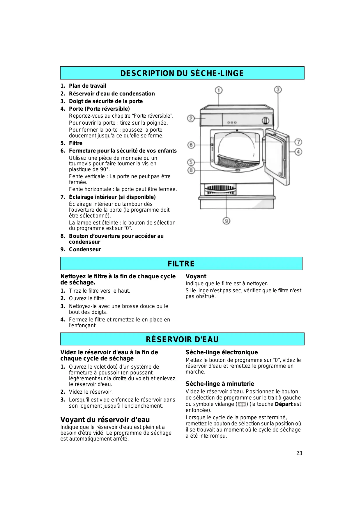 son logement jusqu'à l'enclenchement. Voyant du réservoir d'eau Indique que le réservoir d'eau est plein et a besoin d'être vidé. Le programme de séchage est automatiquement arrêté. Sèche-linge électronique Mettez le bouton de programme sur “0”, videz le réservoir d'eau et remettez le programme en marche. Sèche-linge à minuterie Videz le réservoir d'eau. Positionnez le bouton de sélection de programme sur le trait à gauche du symbole vidange ( ) (la touche Départ est enfoncée). Lorsque le cycle de la pompe est terminé, remettez le bouton de sélection sur la position où il se trouvait au moment où le cycle de séchage a été interrompu.