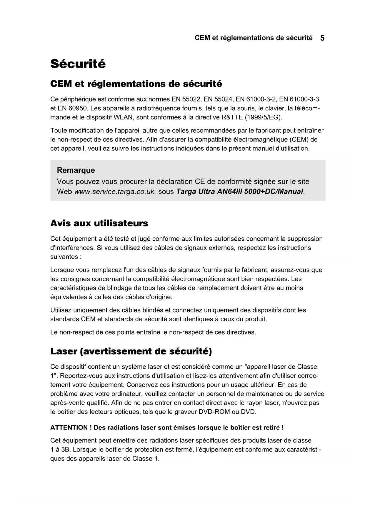 Avant d'utiliser votre nouveau produit pour la première fois, il est conseilé, pour toute autre propre santé et sécurité, de dire attentivement les consignes de sécurité et recommandations sur les conditions ergonomiques d'utilisation. Nous espérons que ce manuel vous aidera à utiliser votre nouveau PC Targa plus facilement et efficacement.