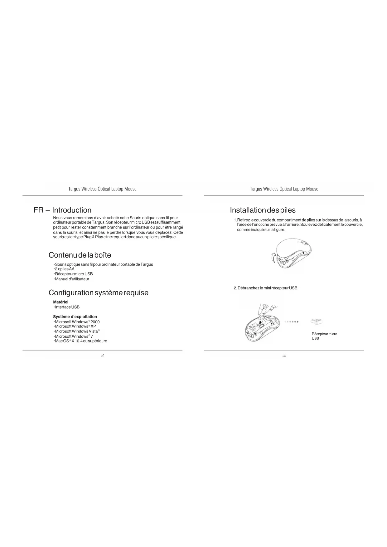 FR – Introduction Nous vous remercions d’avoir acheté cette Souris optique sans l pour ordinateur portable de Targus. Son récepteur micro USB est sufsamment petit pour rester constamment branché sur l’ordinateur ou pour être rangé dans la souris et ainsi ne pas le perdre lorsque vous vous déplacez. Cette souris est de type Plug & Play et ne requiert donc aucun pilote spécique. Conguration système requise Matériel