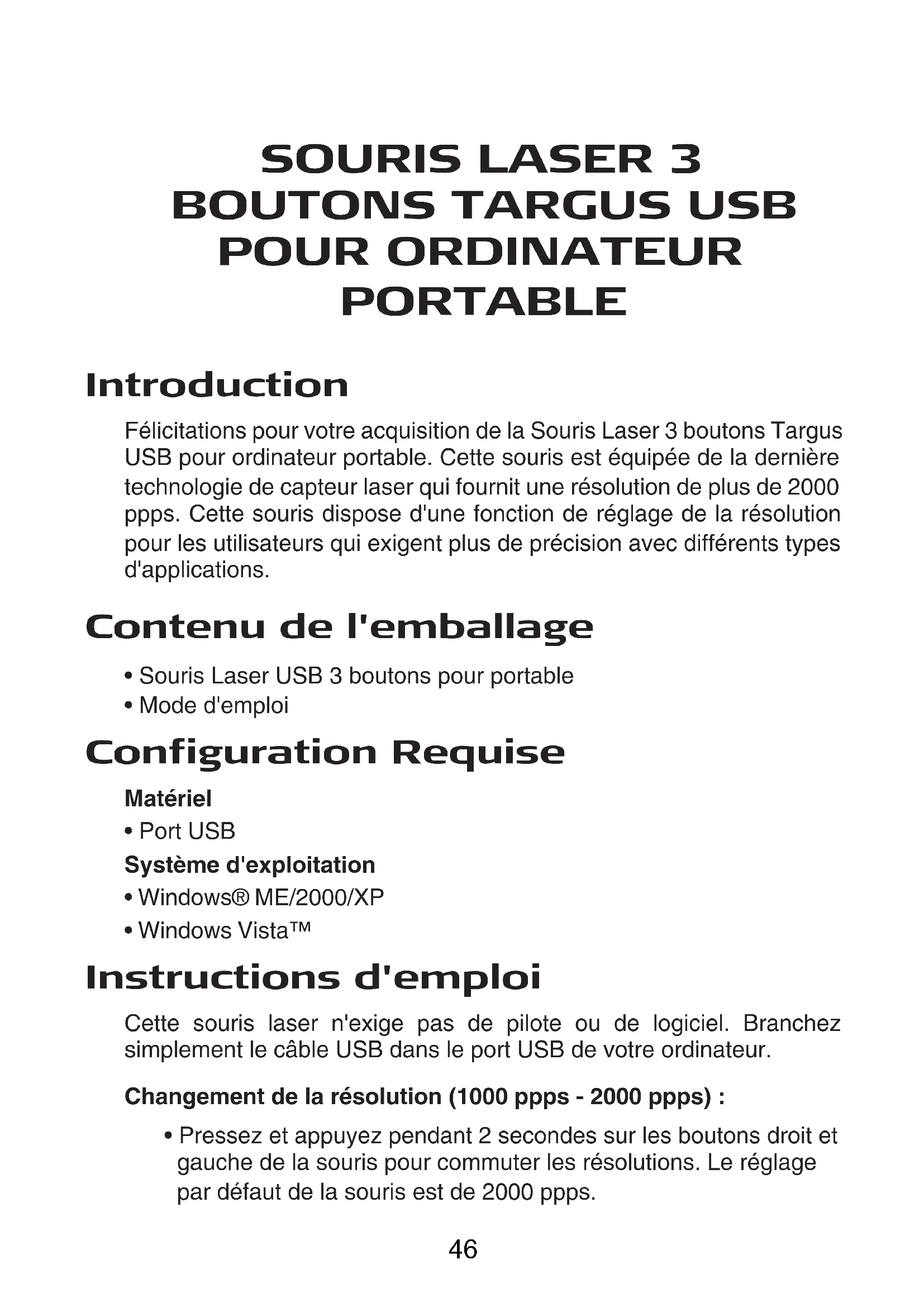 POUR ORDINATEUR PORTABLE Introduction Félicitations pour votre acquisition de la Souris Laser 3 boutons Targus USB pour ordinateur portable. Cette souris est équipée de la dernière technologie de capteur laser qui fournit une résolution de plus de 2000 ppps. Cette souris dispose d'une fonction de réglage de la résolution pour les utilisateurs qui exigent plus de précision avec différents types d'applications. Contenu de l'emballage