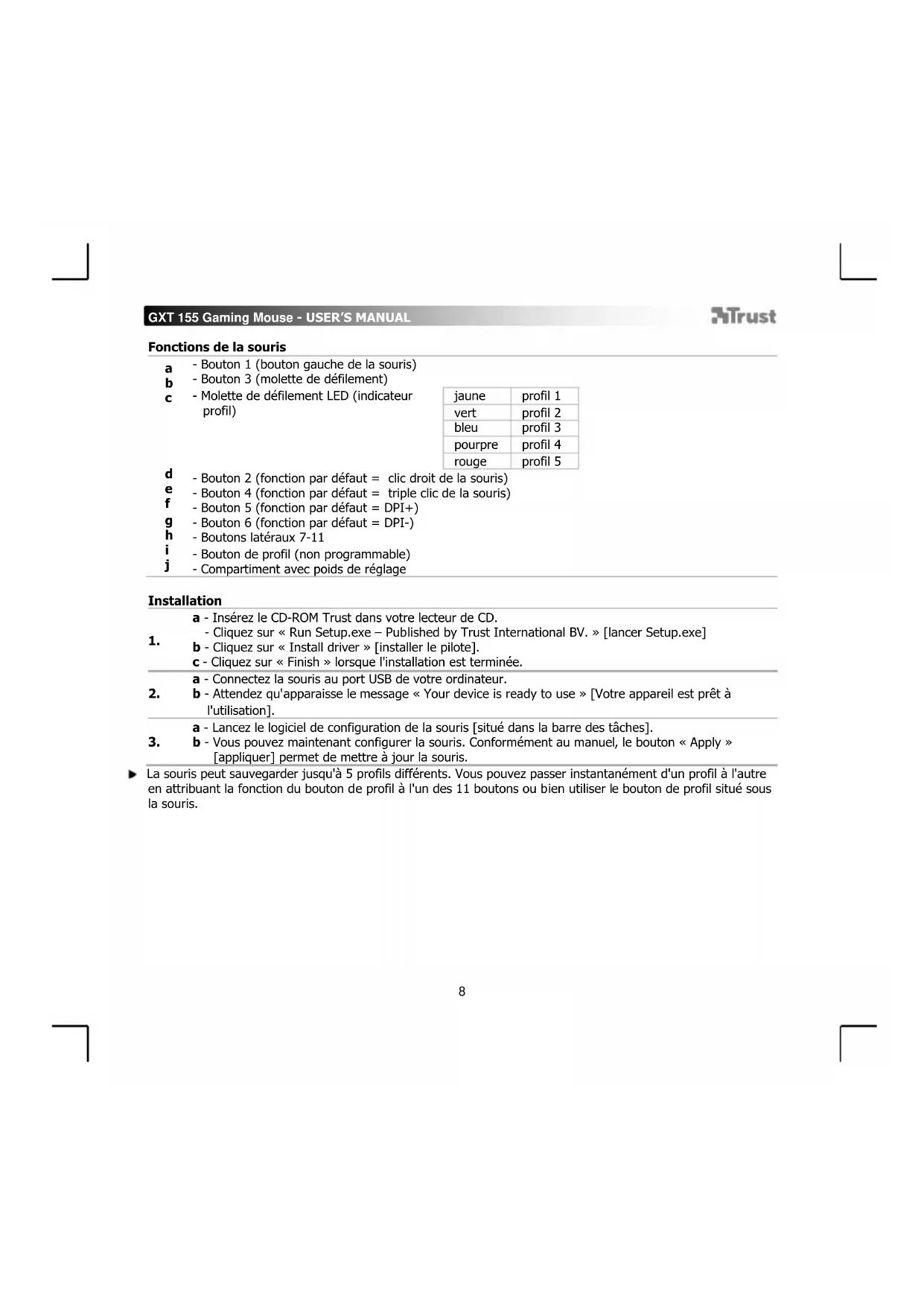 Restaurer les paramètres par défaut - Cliquez sur « Reset All » [tout réinitialiser] pour réinitialiser tous les profils. - Cliquez sur « Restore » [restaurer] pour restaurer un profil (profil actuellement sélectionné). - Cliquez sur « OK » pour réinitialiser tous les paramètres. - Cliquez sur le bouton « Apply » [appliquer] La souris a été mise à jour. Téléchargez les profils de jeu spécifiques sur le site Internet Trust : http://www.trust.com/20411.GXT 155 Gaming Mouse - USER’S MANUAL