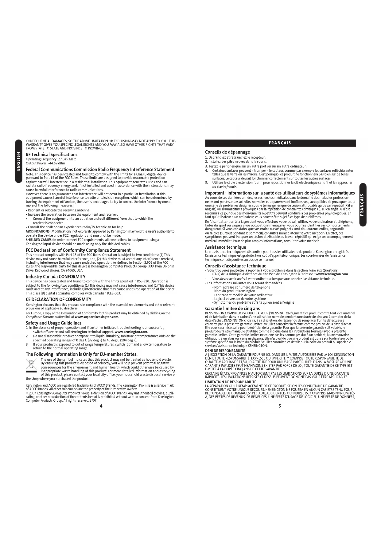Ce périphérique est conforme aux règlementations de la Partie 15 des Régles de la FCC. Son'utilisation est soumise à deux conditions: (1) ce dispositif ne doit pas générer d'interférences nuisibles et (2) il doit accepter tous les signaux brouillies, y compris les interférences pouvant générer un fonctionnement non souhaïte. Conformément à ce qui est défini dans la Section 2 909 des Régles de la FCC, la responsabilité de ce dispositif appartient à Kensington Computer Products Group, 333 Twin Dolphin Drive, Redwood Shores, CA 94065, États-Unis.