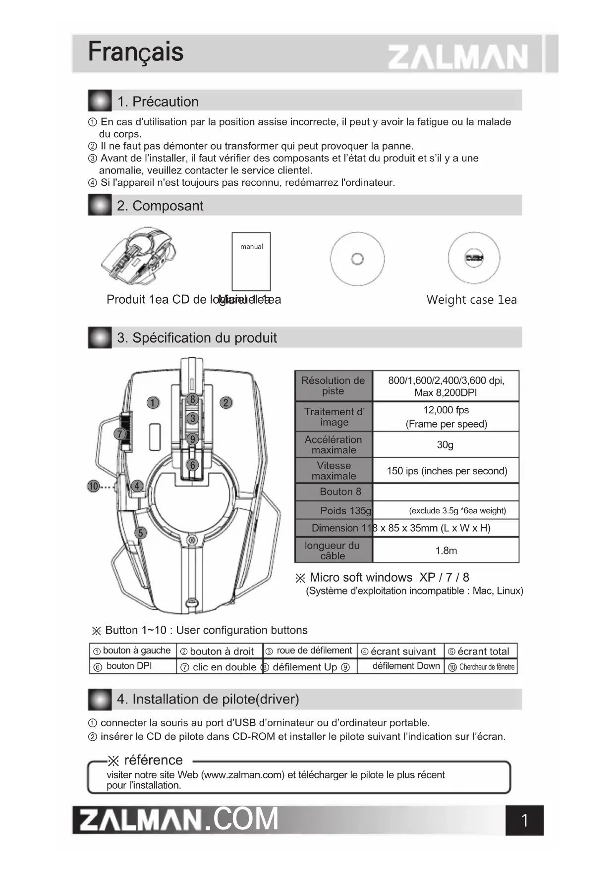 ① En cas d’utilisation par la position assise incorrecte, il peut y avoir la fatigue ou la malade du corps. ② Il ne faut pas démonter ou transformer qui peut provoquer la panne.③ Avant de l’installer, il faut vérier des composants et l’état du produit et s’il y a une anomalie, veuillez contacter le service clientel.④ Si l'appareil n'est toujours pas reconnu, redémarrez l'ordinateur.visiter notre site Web (www.zalman.com) et télécharger le pilote le plus récentpour l’installation.① connecter la souris au port d’USB d’orninateur ou d’ordinateur portable.② insérer le CD de pilote dans CD-ROM et installer le pilote suivant l’indication sur l’écran. ※ référence Résolution de piste800/1,600/2,400/3,600 dpi, Max 8,200DPI Traitement d’image12,000 fps(Frame per speed)Accélération maximale 30g Vitesse maximale150 ips (inches per second) Bouton 8Poids 135g (exclude 3.5g *6ea weight)Dimension 118 x 85 x 35mm (L x W x H)longueur du câble 1.8m ※ Micro soft windows XP / 7 / 8 (Système d'exploitation incompatible : Mac, Linux) bouton à gauche bouton à droit roue de délement écrant suivant écrant total bouton DPI⑦ clic en double ⑧ délement Up ⑨ délement Down Chercheur de fênetre※ Button 1~10 : User conguration buttons