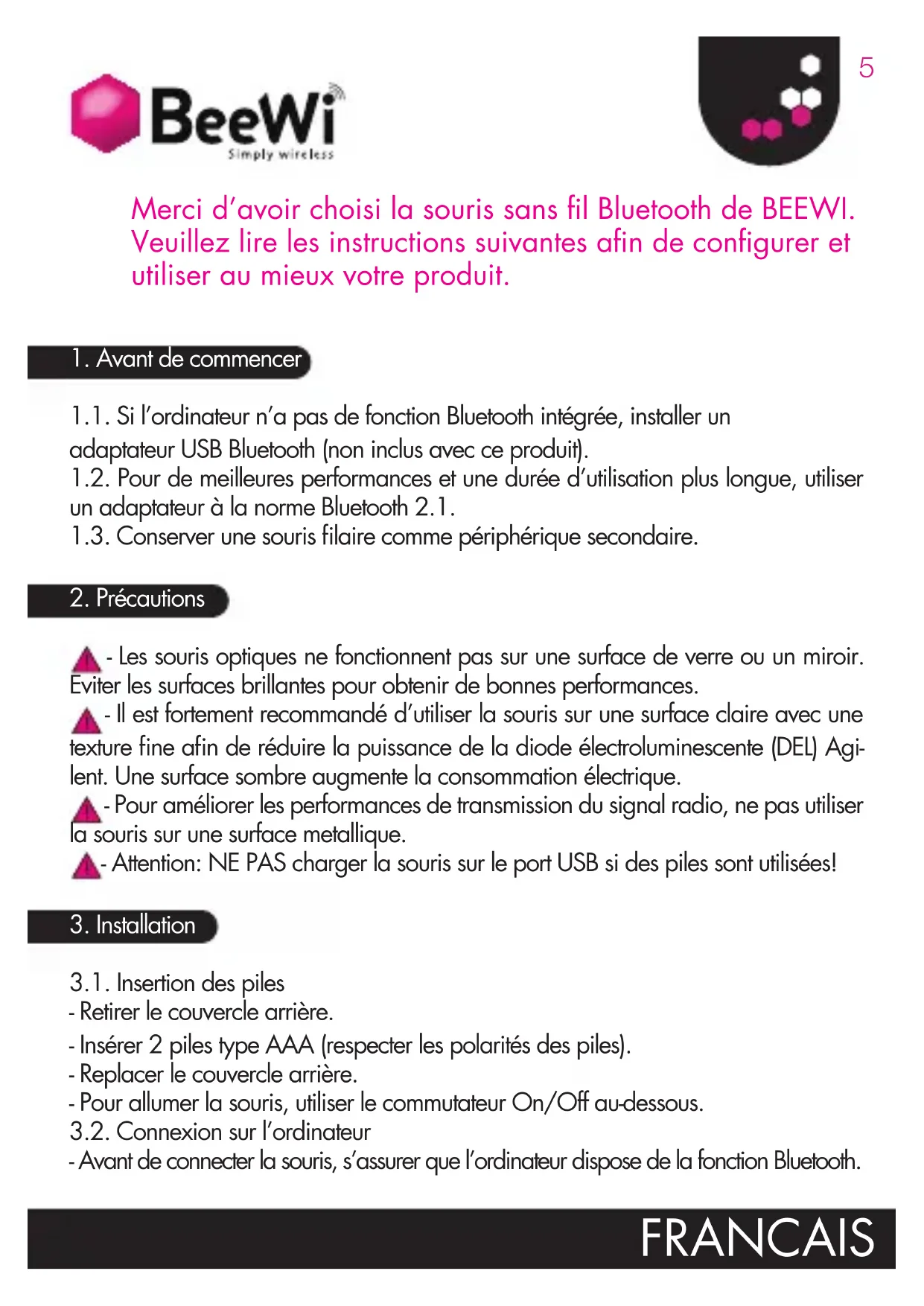 3.1. Insertion des piles - Retirer le couvercle arrière. - Insérer 2 piles type AAA (respecter les polarités des piles). - Replacer le couvercle arrière. - Pour allumer la souris, utiliser le commutateur On/Off au-dessous. 3.2. Connexion sur l’ordinateur - Avant de connecter la souris, s’assurer que l’ordinateur dispose de la fonction Bluetooth. FRANCAIS Merci d’avoir choisi la souris sans fil Bluetooth de BEEWI. Veuillez lire les instructions suivantes afin de configurer et utiliser au mieux votre produit.6 - Presser le bouton de connexion au-dessous jusqu’à ce que la lumière rouge appa- raisse (alternance de l’intensité lumineuse, prêt pour le couplage). - Couplage: lancer le logiciel Bluetooth sur l’ordinateur et suivre les instructions pour découvrir et coupler les périphériques distants. - Note: la souris ne nécessitant pas de code de couplage, cette option doit éventuel- lement être désactivée sur le logiciel Bluetooth.