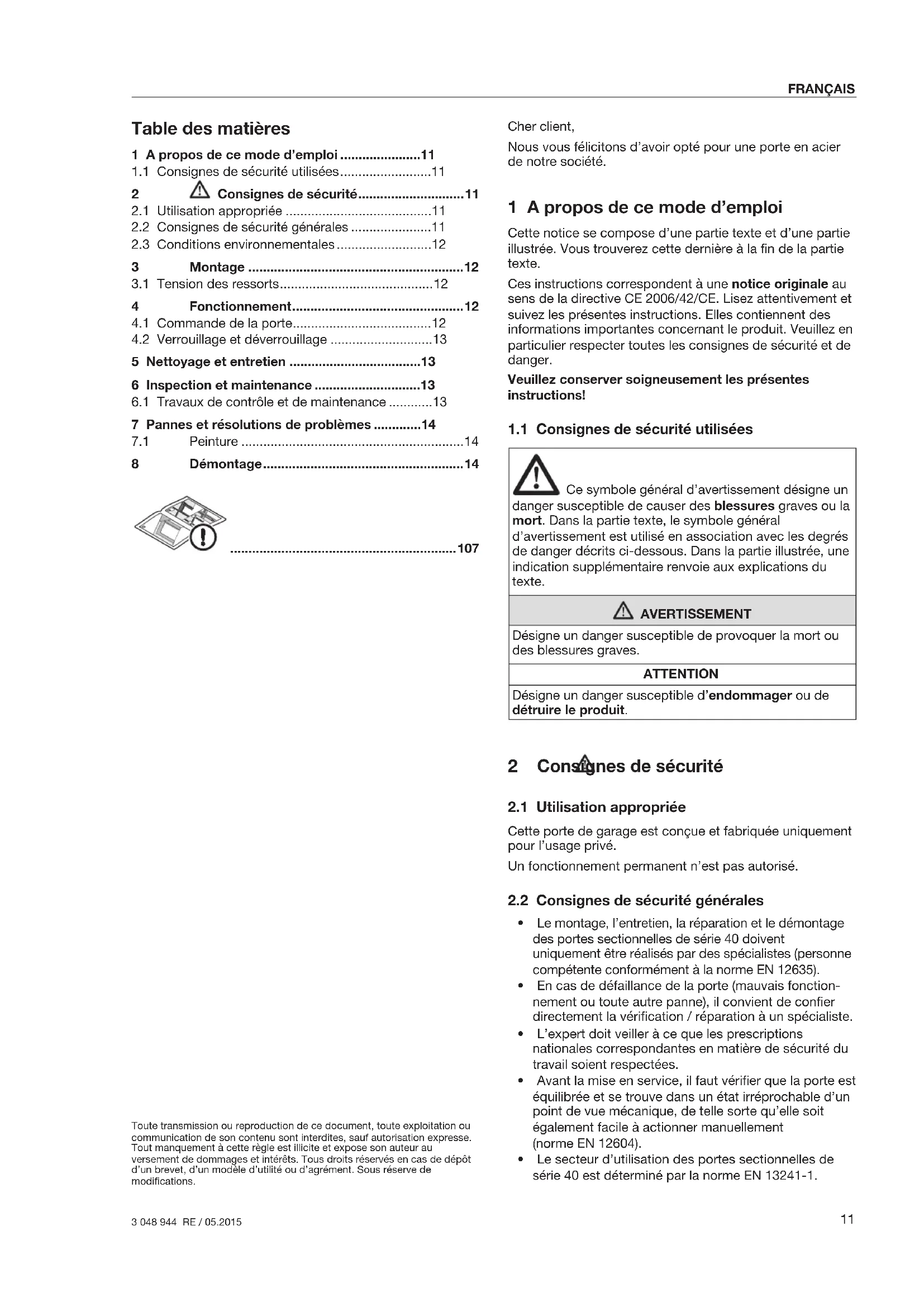 3 048 944 RE / 05.2015 ENGLISHCher client, Nous vous félicitons d’avoir opté pour une porte en acier de notre société. 1 A propos de ce mode d’emploi Cette notice se compose d’une partie texte et d’une partie illustrée. Vous trouverez cette dernière à la fin de la partie texte. Ces instructions correspondent à une notice originale au sens de la directive CE2006/42/CE. Lisez attentivement et suivez les présentes instructions. Elles contiennent des informations importantes concernant le produit. Veuillez en particulier respecter toutes les consignes de sécurité et de danger. Veuillez conserver soigneusement les présentes instructions!