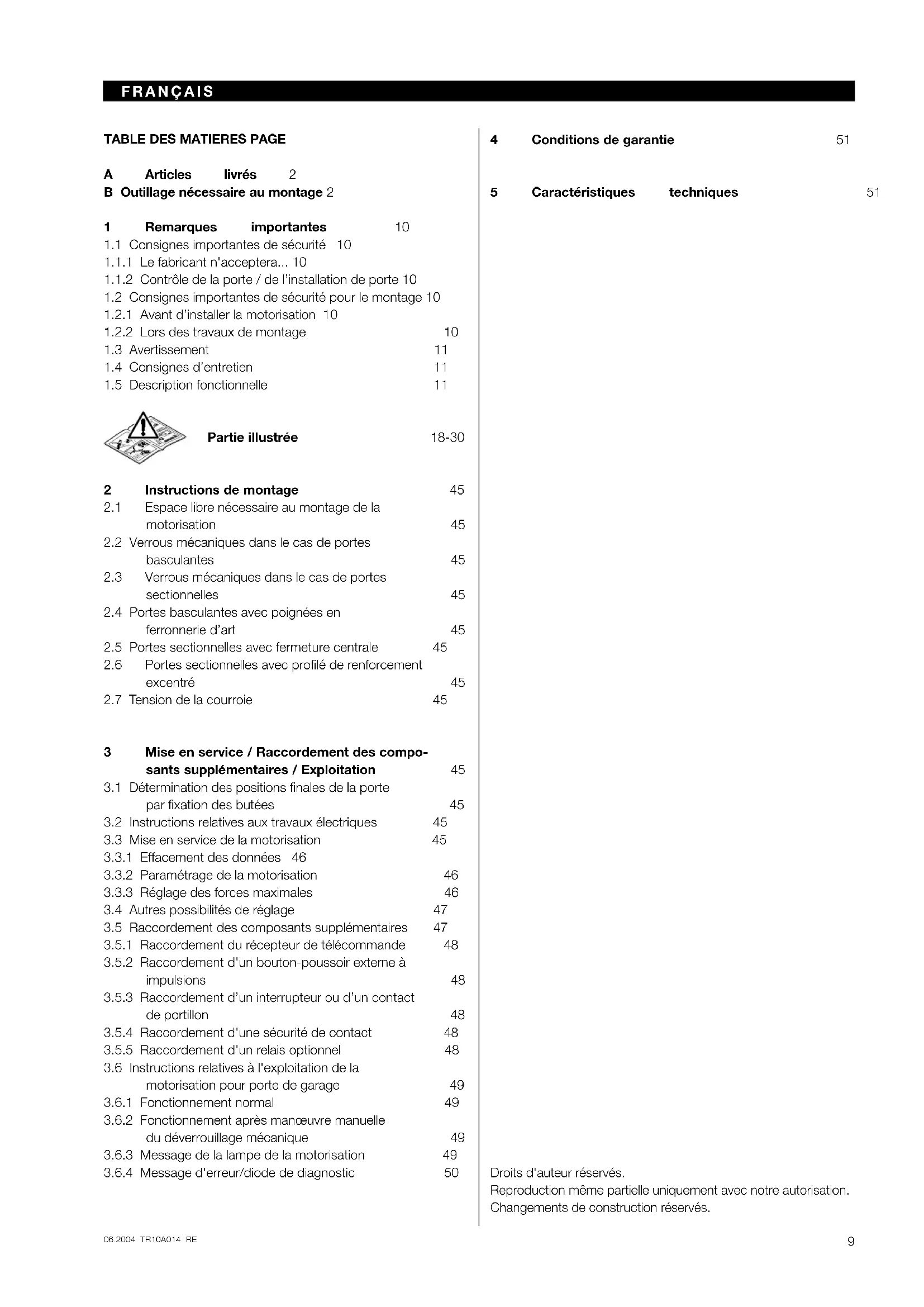 06.2004 TR10A014 RE51 06.2004 TR10A014 RE FRANÇAIS 4 Conditions de garantie Durée de la garantie En complément de la garantie légale du vendeur résul- tant du contrat d’achat, nous accordons une garantie sur les pièces suivantes à compter de la date d’achat: a) 5 ans sur la mécanique de la motorisation, le moteur et la commande électrique b) 2 ans sur la télécommande, les éléments de com- mande, les accessoires et les installations spéciales Les moyens de consommation (p. ex. fusibles, batteries, moyens d’éclairage) sont exclus de la garantie. Le re- cours à la garantie ne prolonge pas cette dernière. Pour les livraisons de remplacement et les réparations, le délai de garantie est de six mois, il est toutefois au moins égal au délai de la garantie en cours. Conditions Le droit à la garantie n’est applicable que pour le pays où l’appareil a été acheté. La marchandise doit avoir été acquise par la voie de distribution que nous prescrivons. Le droit à la garantie n’est applicable que pour les dom- mages subis par l’objet contractuel lui-même. Le rem- boursement de frais liés au démontage et au remontage, la vérification des pièces concernées ainsi que les reven- dications de manque à gagner et de dommages-intérêts sont exclus de la garantie. Le bon d’achat fait office de justificatif pour votre droit à la garantie. Prestation Pendant la période de garantie, nous éliminons tous les désordres présentés par le produit pour autant qu’il a été prouvé que ces derniers résultent d’un défaut ou d’un vice de matériel ou de fabrication. Nous nous engageons, à notre choix, soit à remplacer gratuitement la marchan- dise entachée de vices ou de défauts, soit à la mettre en conformité ou à accorder une moins-value. Exclus sont les dommages résultant: - d’un montage et d’un branchement incorrects - d’une mise en service et d’une manipulation non correctes - d’influences extérieures, telles que le feu, l’eau, des conditions de l’environnement anormales - de détériorations de nature mécanique dues à un accident, une chute, un choc - d’une destruction involontaire ou intentionnelle - de l’usure normale ou d’un manque d’entretien - d’une réparation effectuée par du personnel non qualifié - de l’utilisation de pièces non originales - de l’enlèvement d’un numéro de production ou d’un numéro de production devenu méconnaissable Les pièces remplacées sont notre propriété. 5 Caractéristiques techniques Raccordement au 230/240 V, 50/60 Hz, en réseau: veille environ 4,5 W Indice de protection: Uniquement pour locaux secs Automatisme d'arrêt: Paramétrage automatique, séparé pour les deux directions. Coupure en position Paramétrage automatique, sans finale / Limiteur usure puisque sans contacteur d'effort: mécanique, limitation de durée (env. 45 secondes) supplémen- taire intégrée. Lors de chaque trajet, ajustage complémentaire de l'automatisme d'arrêt. Charge nominale: 150 N Force de traction et de poussée: 500 N Effort de pointe: 650 N Moteur: Moteur courant continu avec capteur Hall Transformateur: Avec sécurité thermique Technique de Système sans vis pour les appa- raccordement: reils externes avec tension de sécurité de 24 V, pour les boutons extérieurs et intérieurs, fonction- nement par impulsion. Autres fonctions: - Lampe témoin de fonctionne- ment, reste allumée pendant 3 minutes (réglage d'usine) - Possibilité de raccorder un coupe-circuit - Possibilité de raccorder une cellule photo-électrique ou une sécurité de contact - Relais optionnel pour feu avertisseur, éclairage externe supplémentaire Déverrouillage rapide: En cas de coupure de courant, de l’intérieur par câble de traction. Télécommande: Avec émetteur à deux touches HS 2 et récepteur séparé. Ferrure universelle: Pour les portes basculantes et sectionnelles Vitesse de déplace- Environ 14 cm par seconde ment de la porte: (en fonction de la taille et du poids de la porte) Niveau acoustique de la motorisation: ≤ 70 dB (A) Rail de guidage: Extrêmement plat 30 mm, avec sécurité anti-intrusion intégrée et courroie dentée brevetée à tension automatique. Application: Exclusivement pour les garages privés. Pour les portes section- nelles ou basculantes légères jusqu’à 10 m